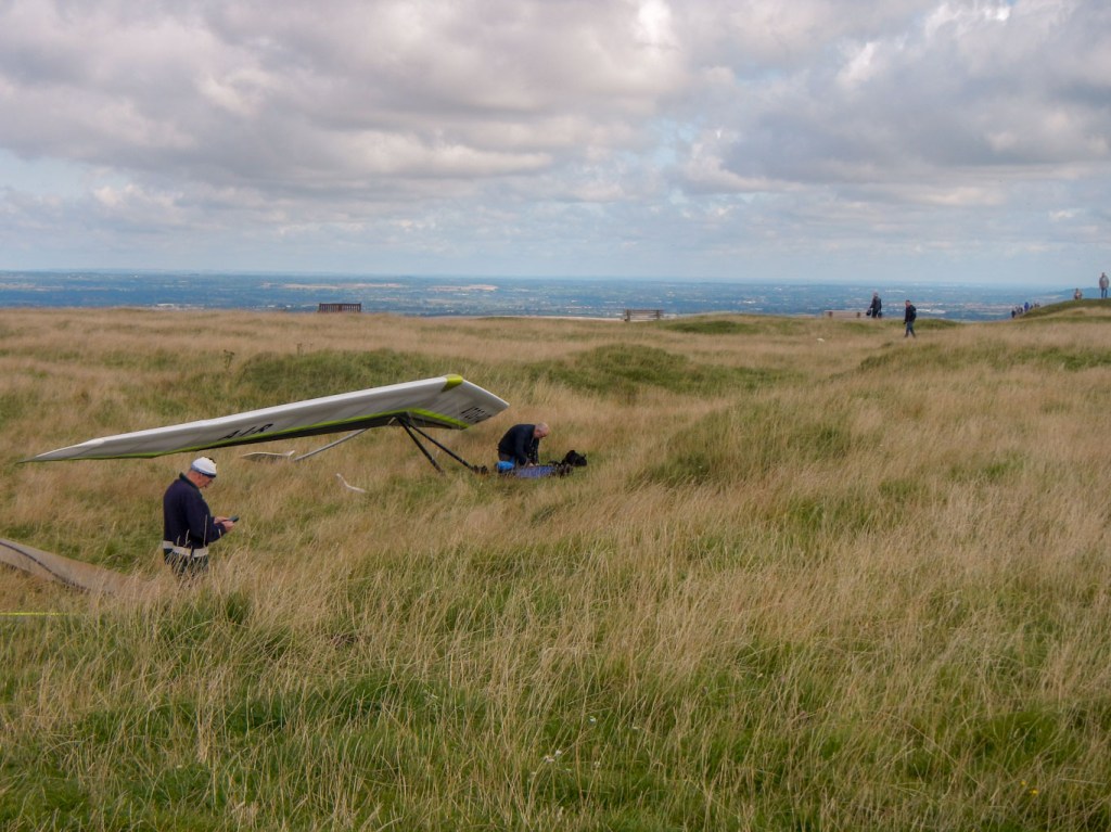 - Westbury White Horse is huge and was carved into the hillside. Local records suggest that the horse was originally cut in the late 1600s, probably to commemorate the supposed Battle of Ethandun, thought to have taken place at Bratton Camp in AD 878. However the form of the carving changed and the current design probably dates from the second half of the eighteenth century. As I visited on a dry, sunny although windy Sunday, there were many paragliders taking off and landing within view of the white horse. I spent some time standing by the viewpoint trying to capture the “perfect” scene of a paraglider backed by the white horse. I also saw some people preparing hang gliders but didn’t see them take off. Further round the hill, a group of enthusiasts was flying radio controlled model aircraft.