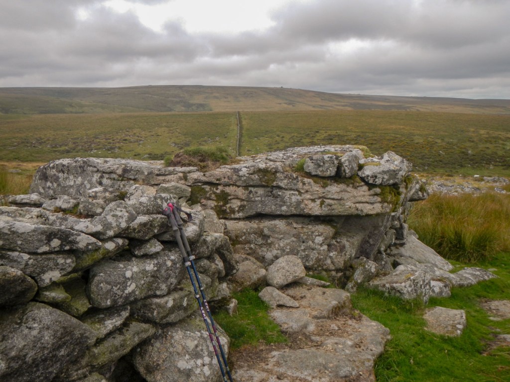 As I approached the tor, a solitary walker came in the opposite direction and there was a further walker sitting eating lunch and perusing his map at the top. I didn’t stop but looked for the path down towards Hugh Lake Foot as I knew that I could cross the North Teign River at that point. Unfortunately when I reached the area there were lots of cows there too. The current relatively low water levels meant that I was able to get across just up stream of where I had planned to cross and climb out of the valley to Stonetor Hill. I sat on the tor, which was incorporated into a stone wall, to eat lunch.