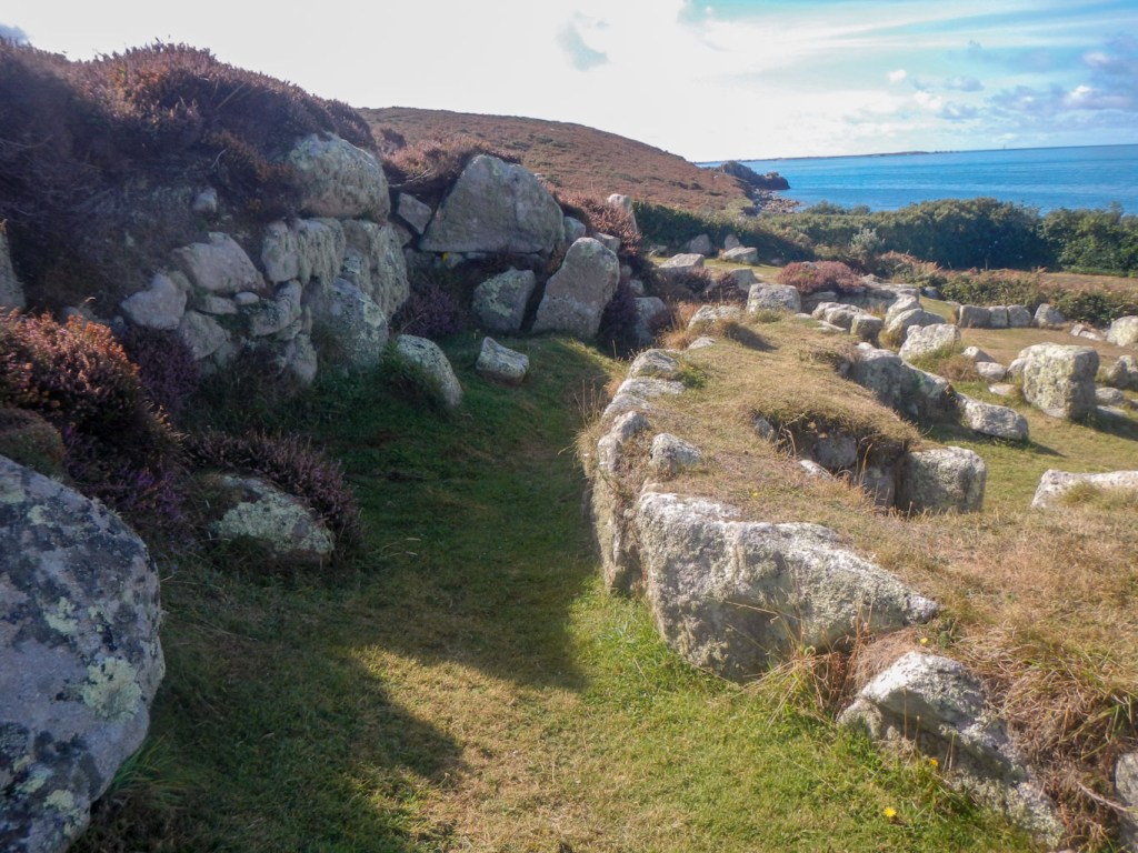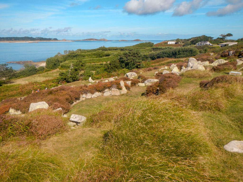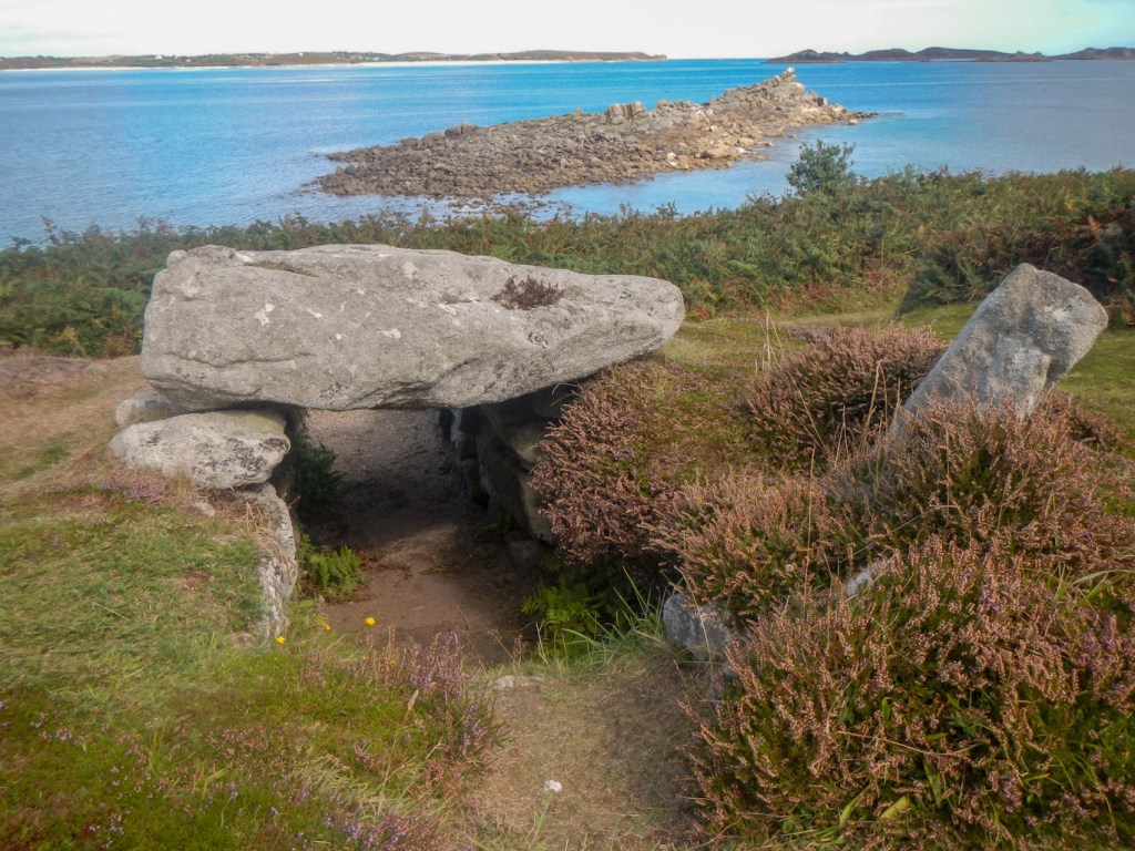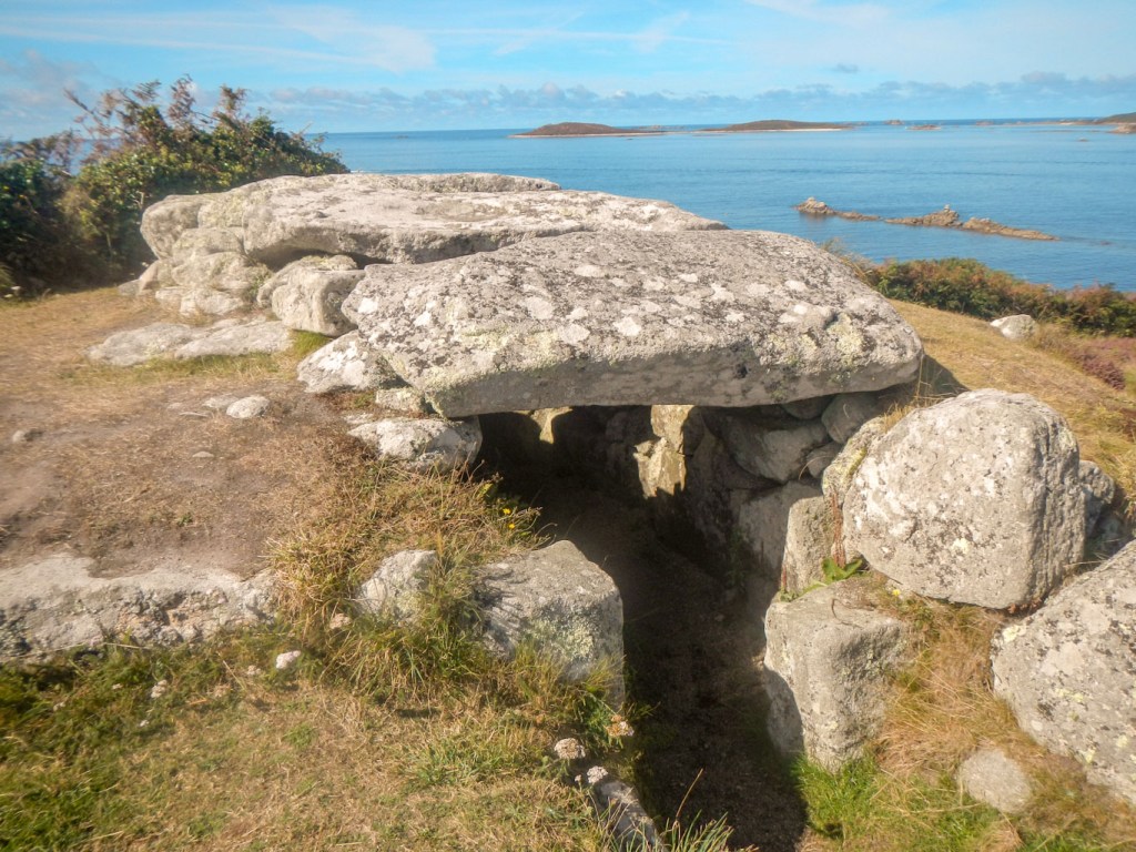 - As we walked round St Mary’s we discovered several well preserved Bronze Age burial chambers, known as entrance graves. These are characteristic of the Scillies and parts of Cornwall. Most comprise a roughly circular mound retained by a stone kerb and built over a rectangular, stone-lined chamber which is roofed with large granite slabs. Entrance graves seem to have continued in use on Scilly long after individual burial had become the usual practice on the mainland. Having realised what they look like, it is possible to pick out other less well preserved examples both on St Mary’s and on the other islands. In prehistoric times sea levels were lower so the current islands of St Mary’s, Tresco, Bryher and St Martin’s would have been a single land mass.