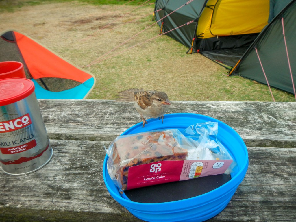 We puzzled over the campsite map to work out exactly where we were meant to put our tent – but got it right in the end. The areas for camping were divided with hedges so there were only two other tents that we could see from our pitch. The hedgerows included lots of brambles weighed down with large ripe blackberries, proving a welcome addition to my breakfast porridge each morning. We were warned by the campsite warden about the gulls, but some of the smaller birds were rather more hopeful than harmful.