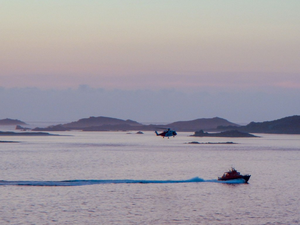 - We walked from the campsite down the hill to the west coast of the garrison peninsula to watch gig racing to St. Agnes. The highlight turned out to be a glorious sunset but we didn’t have our cameras. As the sun sank below the horizon, reflected light on clouds to the north and south resulted in an amazing rainbow effect. After this awesome display, a stroll down to the west coast became a daily event. Sadly there was no sunset to compare with that first experience. However on the final evening there was no cloud on the horizon so we did witness the sun dipping below the horizon. Immediately after this, while the sky was still red, we were treated to a display of helicopter flying as there appeared to be a joint lifeboat and coastguard practice. The coastguard helicopter hovered just above the lifeboat and later on the coastguard winched someone into the helicopter.