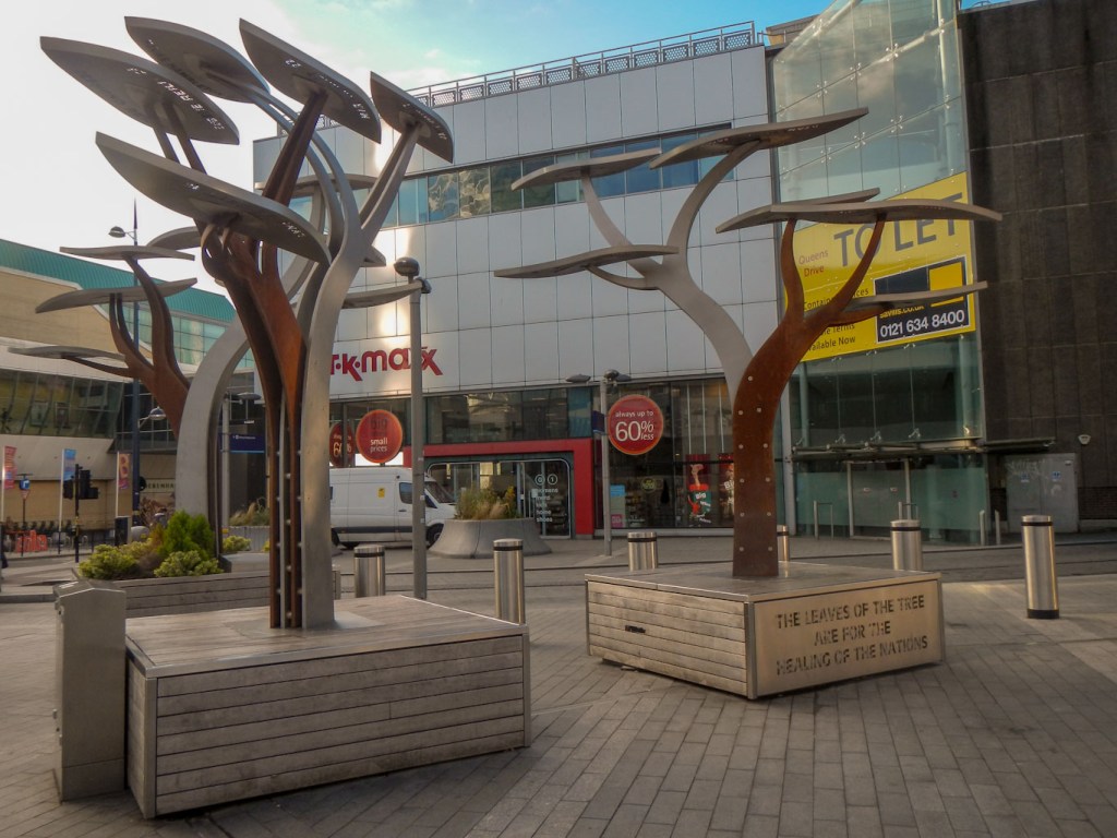 I caught a packed train with standing room only from Nuneaton to Birmingham New Street – totally my fault as there really wasn’t any need to reach Birmingham before 09.00 when I only had about sixteen miles or so to walk on what would be good flat paths with little route finding difficulty. As I waited at Nuneaton, I noticed several long freight trains of shipping containers passing through – in the absence of rail (and good roads), this type of transport would all have relied on the canals in the past.