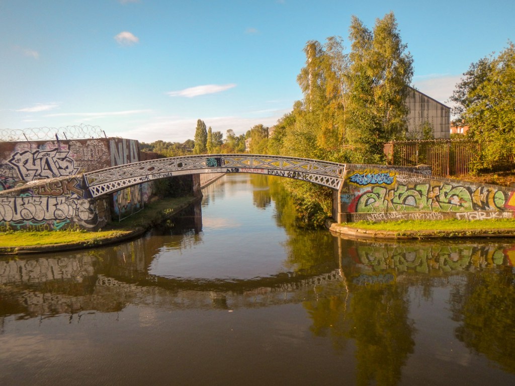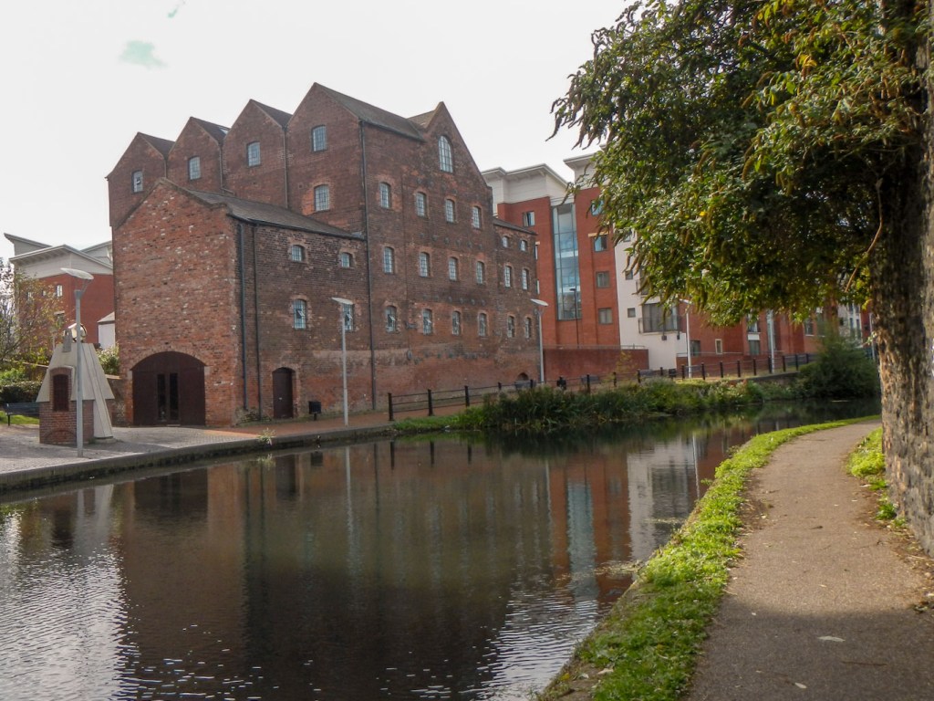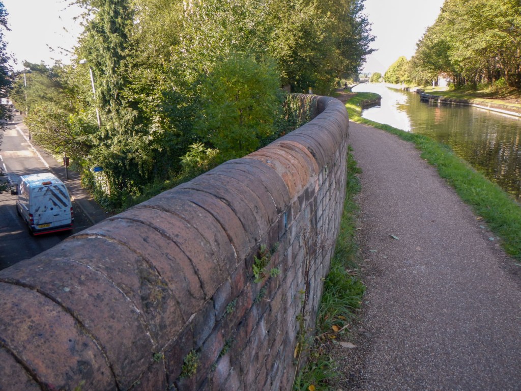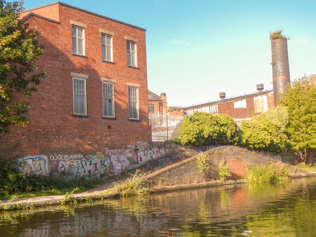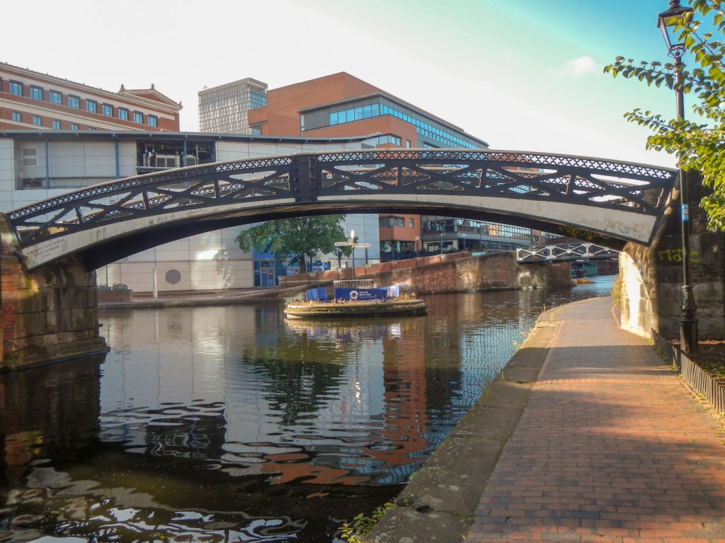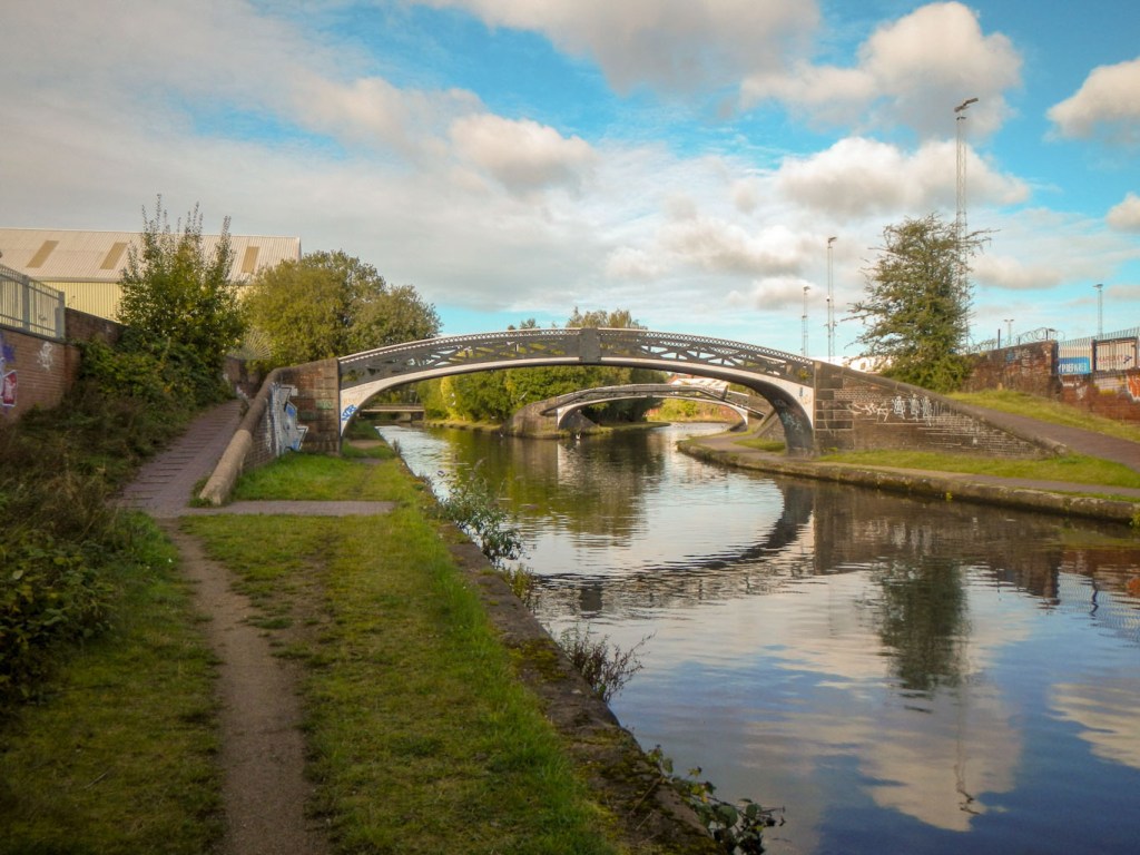 I saw many canal junctions, crossed a few aqueducts and spotted multiple iron bridges, the latter bearing plaques denoting the foundry which had built them. I even passed under the 1825 engine arm aqueduct built in 1825 by Thomas Telford to carry water from Edgbaston Reservoir over the New Main Line to the parallel Old Main Line. It’s a Grade II* listed monument. When I passed under it, I was impressed enough to take a photo but didn’t realise until I found it on-line later that it is an aqueduct carrying an eight-foot wide waterway rather than merely yet another bridge.