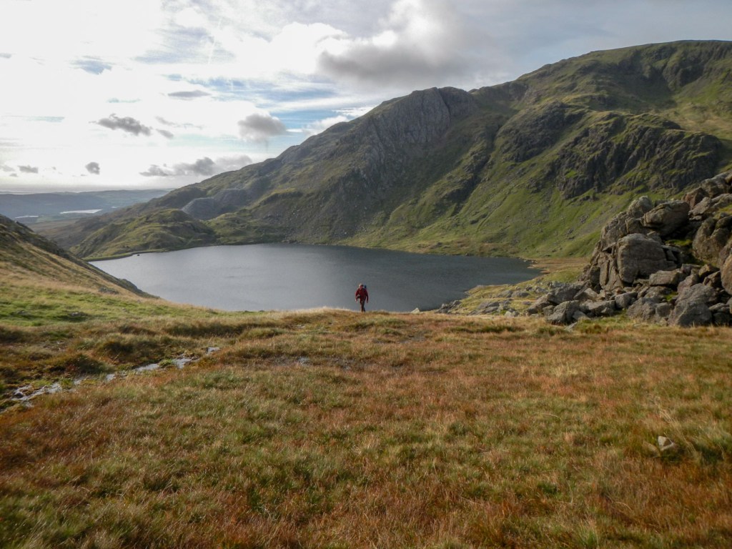 We set off on a well made path. In our enthusiasm to get going, we realised that we hadn’t taken the turning after just under a mile off the “tourist” path up Coniston Old Man so we had to back track a few metres prior to heading off towards Levers Water Beck, with its attractive rapids and waterfalls. We proceeded from the beck up Boulder Valley to Levers Water, crossing the outlet from the reservoir dam and following a less distinct path to the col at Swirl Hawse, where there were good views.