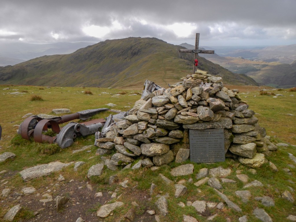 We headed off towards our third Wainwright peak, Great Carrs, noticing a cairn and some aircraft remains on the left. We detoured to look at this which was a memorial to the eight man crew of a Halifax bomber that crashed in fog on a training flight in 1944. Another walker, local to the area, was photographing the site and reflected on the young age of most of the crew of seven Canadians and one Scotsman. Six were in their late teens or early twenties, the pilot age 27 and the experienced navigator age 33. He also recounted a couple of stories about bits of wreckage being taken from the site and the people removing them receiving visitation from an apparition of the pilot.