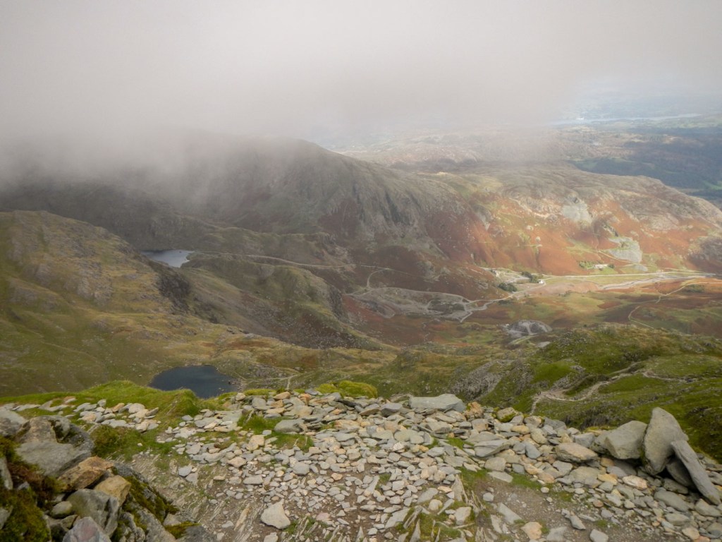 We discovered that the contouring path to The Old Man is delightful, including good views towards Dow Crag. In fact the path was so good that we stayed on it for a bit too long and ended up needing to climb straight up the hillside on to the ridge once we realised we were starting to descend towards Goats Hawse. Sadly at this point the cloud base lowered and we could see the summit of The Old Man ahead of us drifting in and out of visibility. Nonetheless, we were able to catch some views over Coniston Water before making our way to Goat’s Hawse. There were some excellent views of the ominous looking steep and deep gullies on the sheer east facing cliffs of Dow Crag.
