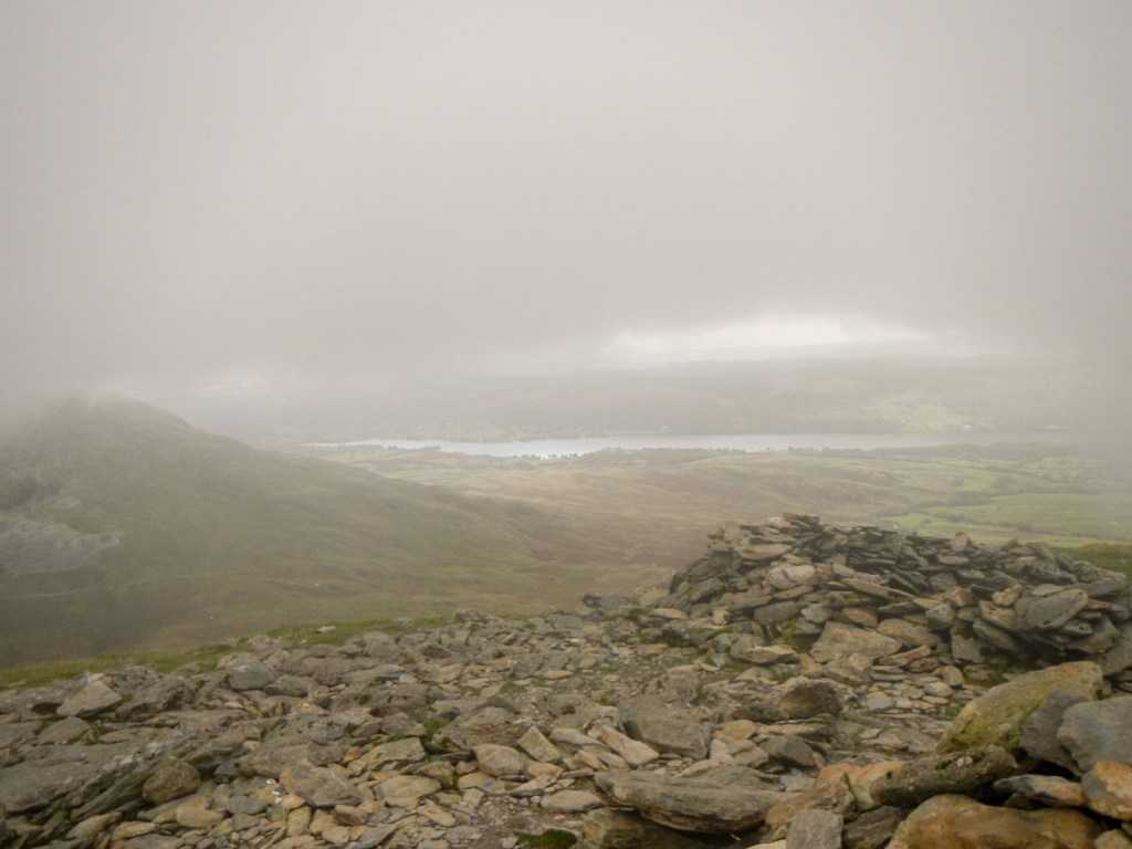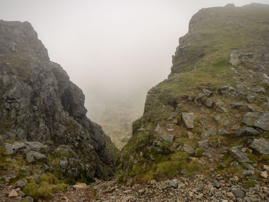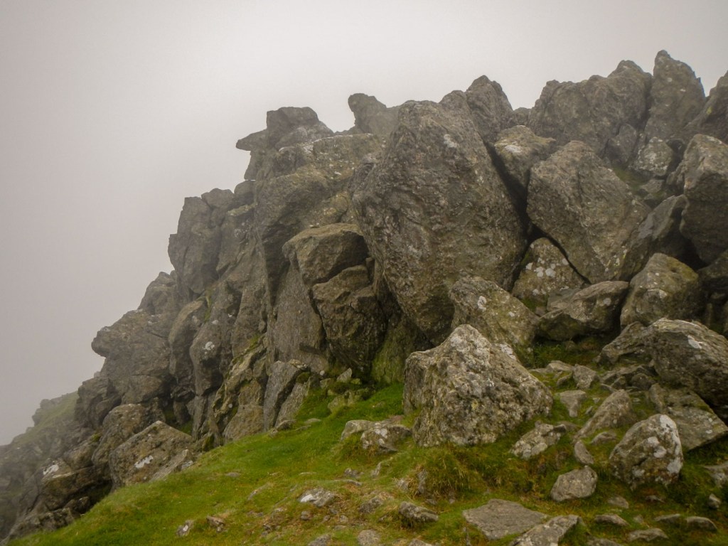 My husband took the short cut past Goat’s Water, while I headed up to a now mist shrouded Dow Crag, taking care to keep well away from the cliff edge. I didn’t scramble up the rocks to stand on the very top but admired the crags from the base then went on past Buck Pike to Brown Pike. There were good views down some impressive looking steep gullies but sadly the mist obscured the promised impressive views to Blind Tarn.