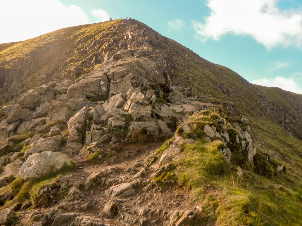 I followed the less popular lower path until I arrived at a large slab of rock where there appeared to be little choice but to clamber up on to the ridge. I stowed my poles in my rucksack and scrambled upwards. I arrived at a place on the top of the ridge where it appeared to be necessary to make a big step across a gap with a huge drop. I definitely wasn’t up for that but a man told me that the only other possibility was to retrace my steps and find the path on the north below the one I had followed initially. Fortunately though I managed to find a way round this big step on the south side of the main ridge.
