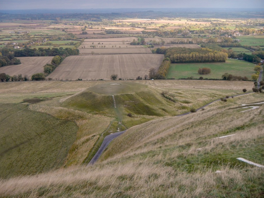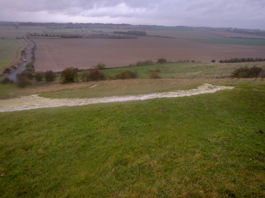 A long way down lies Dragon Hill, a small roundish hill with a flattened top. It is said to be the site where St. George, England’s patron saint, slew the dragon. The blood poisoned the ground and left a white chalk scar for all to see. I did walk all the way down to Dragon Hill, up to its summit then returned via the Manger; downhill from the White Horse this is a dramatic dry valley with steep rippled sides left from the retreating permafrost during the last Ice Age. The ripples are known as the Giant’s Steps.