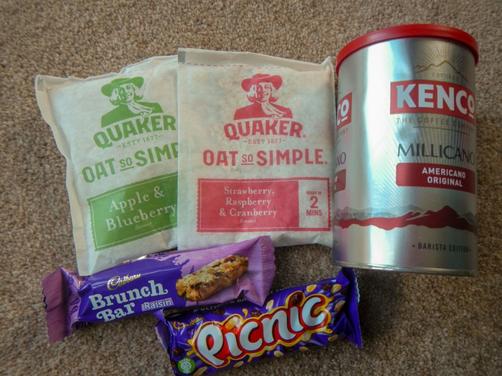 Instant porridge in sachets – just add boiling water. I usually have 2 or 3 sachets each day. A sachet of instant custard powder can be added to the mix adding to the flavour and the calorific value. Foraging for wild fruit – bilberries, blackberries etc. is possible and these can add some more flavour and vitamin content. However you need to be sure that you know what you have picked before you eat them to avoid being poisoned!