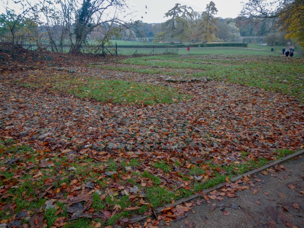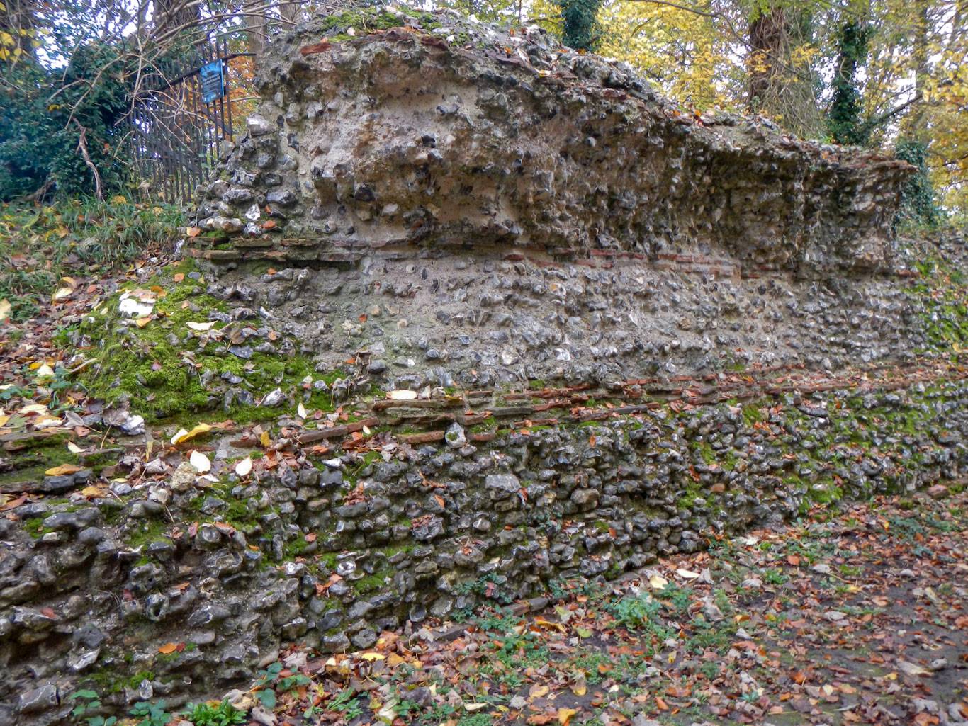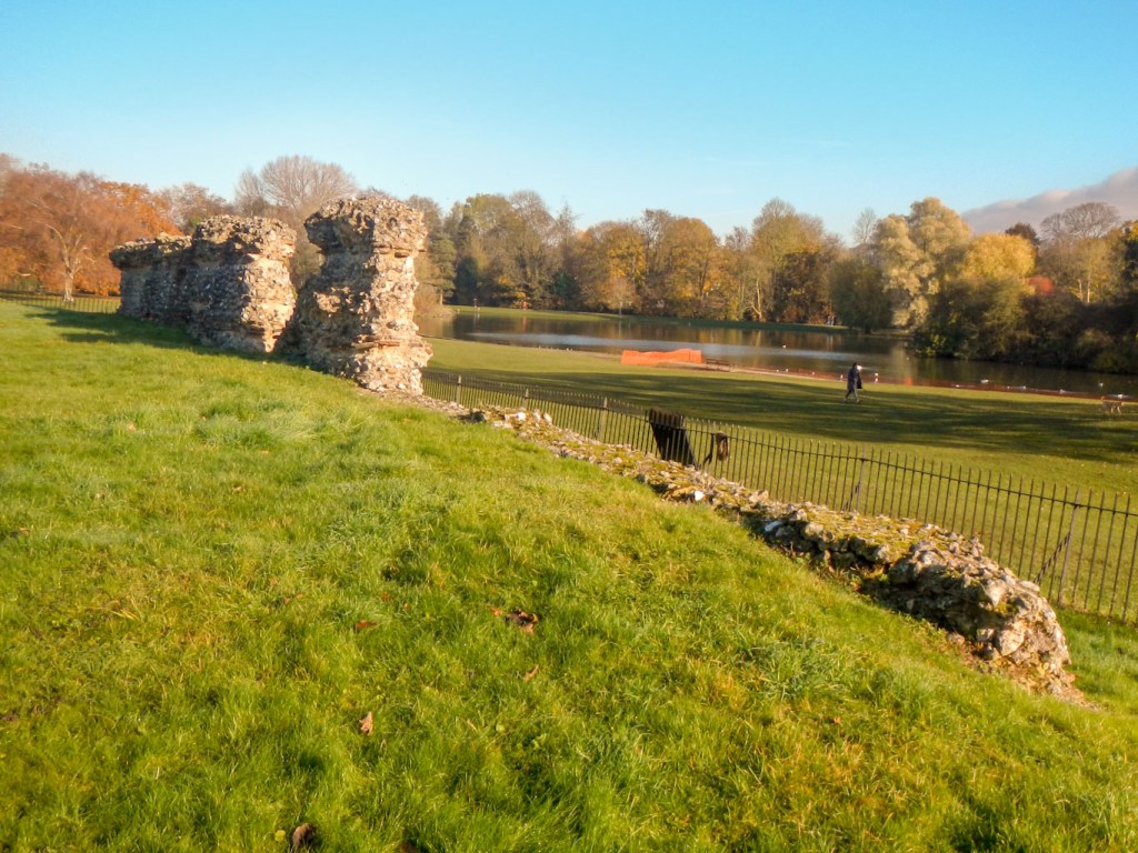 I walked through the Abbey Orchard towards the River Ver and Verulamium Park. Beneath this park lie the remains of the third largest city in Roman Britain. This Roman city is uniquely special in that the later city of St Albans was not built over the Roman city but alongside it. However bricks from Verulamium were used to build later buildings including the nearby St Michael’s Church and the Abbey (now incorporated into the cathedral). Much of the Roman city lies below agricultural land and has not been excavated.