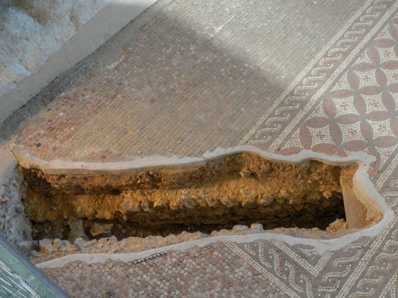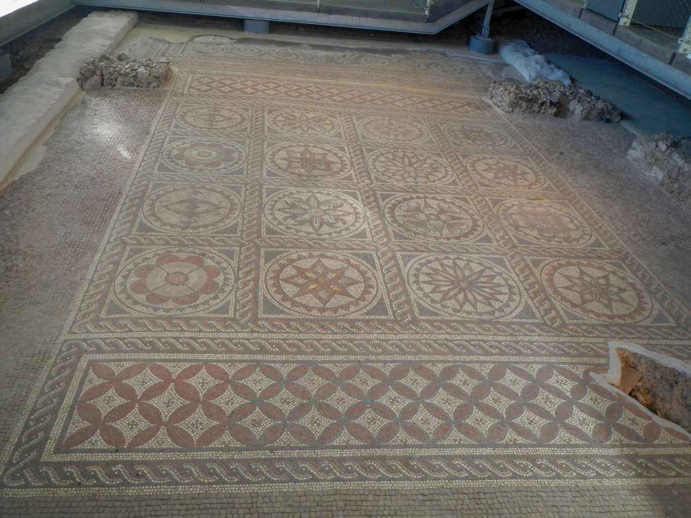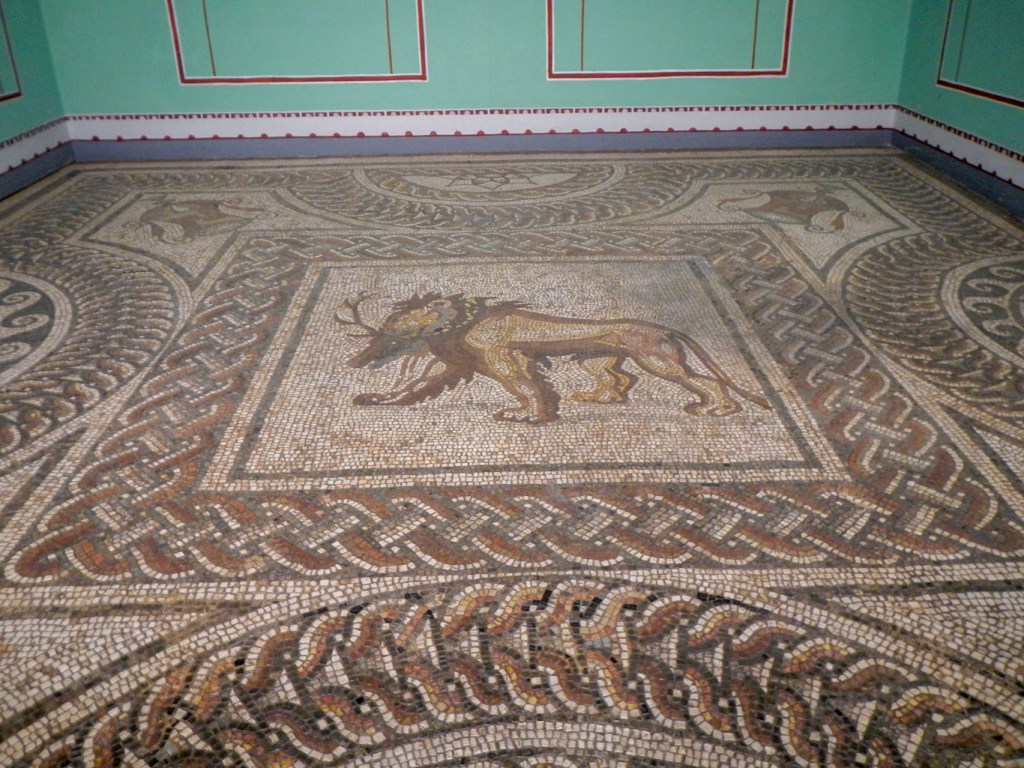 I walked up the hill from the Roman wall fragment towards a building which houses an impressive Roman mosaic on top of a hypocaust. Roman hypocaust systems allowed hot air to circulate beneath the floor and through the walls of buildings. In this building, trenches were cut below the floor to allow the hot air through. The mosaic covering the hypocaust is made of small cubes of cut stone or tile set into a thin layer of fine mortar which was spread over a concrete floor. The floor was left in its original location after it was discovered in the 1930s and is thought to have been part of the reception and meeting rooms of a large town house, built around AD 200.
