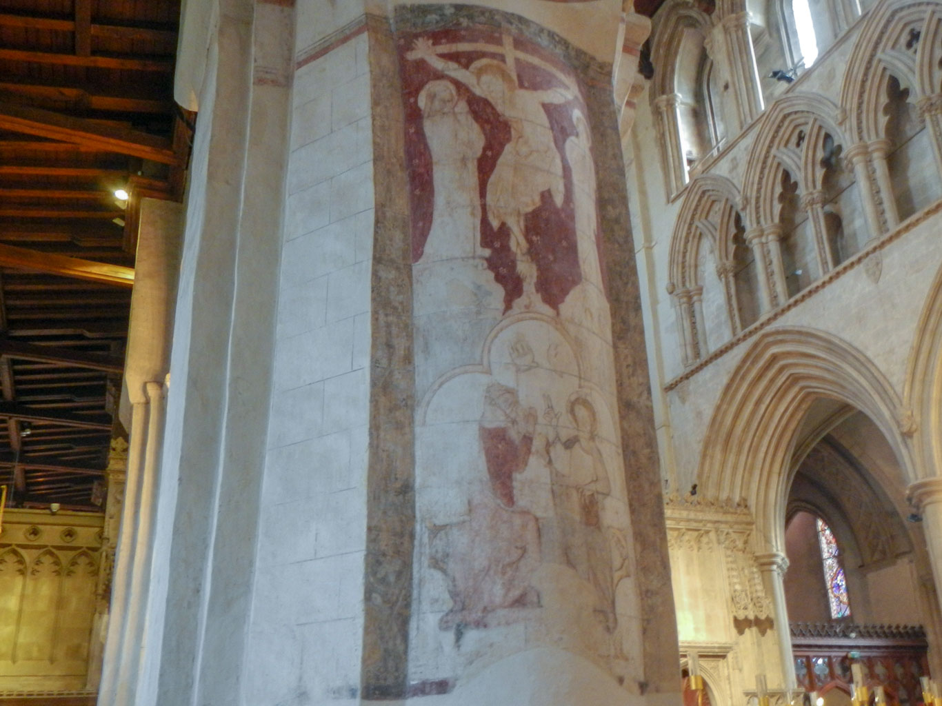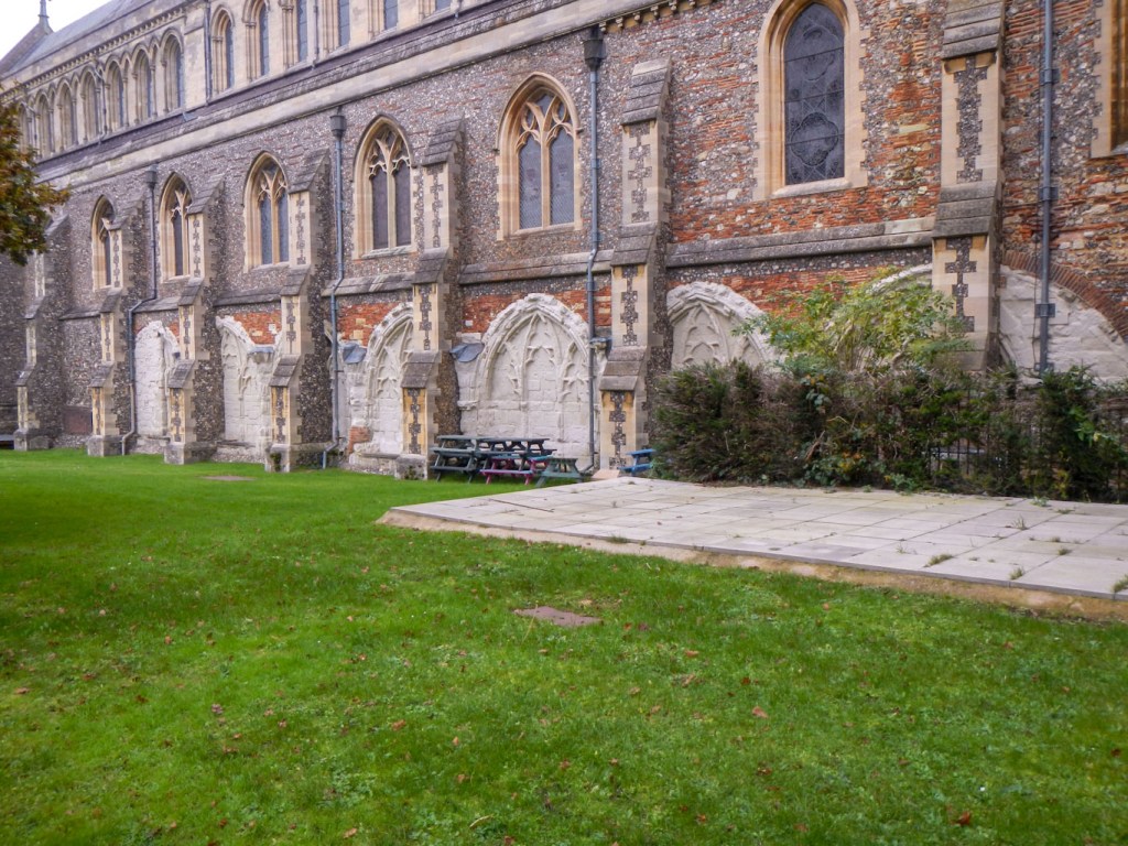 During our time outside, I noted a Cathedral Guide who had been leading a tour of the interior at the time of the alarm; with the utmost professionalism she continued to talk but about the exterior of the building as we waited to return into the Cathedral. The enforced time standing outside did give me plenty of time to look at the brickwork including all the Roman bricks which had been reused. I could also see the outline of the white stone cloister arches on the wall – a legacy of the cloisters of the medieval abbey on which the cathedral was constructed.