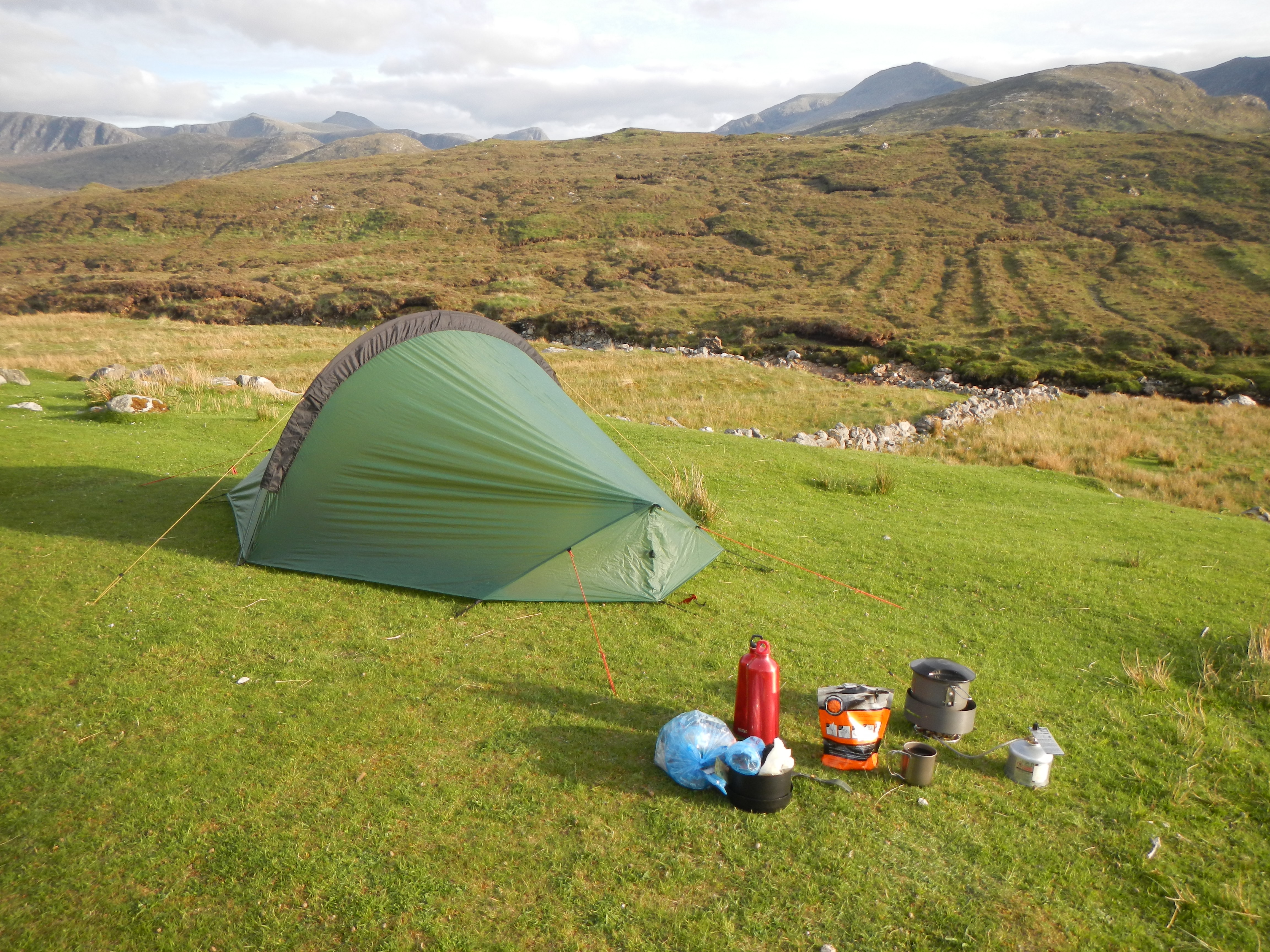 I use a gas stove and have two to choose from. The lightest weight option is a small burner and a titanium pot, but this is unstable and has no wind shield so it can waste fuel as well as tending to fall over. Usually I use a heavier but more stable alternative with a wind shield. The entire set packs together well although isn’t as compact as the small burner with pot. It can be used more easily if the ground isn’t flat and I can manage to operate it a foot or so outside the tent while I stay in the tent and lean out – useful in rain or if there are a lot of midges. The set lights with a piezo but I still carry matches and a lighter. These don’t weight much and it wouldn’t be great to be in the middle of nowhere with all the equipment but no means of lighting the gas.