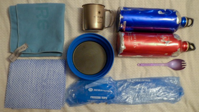 My bowl, mug and cutlery (a titanium spork as the plastic ones are prone to break) along with a dish cloth and a lightweight towel to use as a tea towel. I carry two times one litre water bottles which I use to drink from in the day and as water carriers at the camp site. A supply of food bags is useful and I keep reusing the same bags until they fall apart.