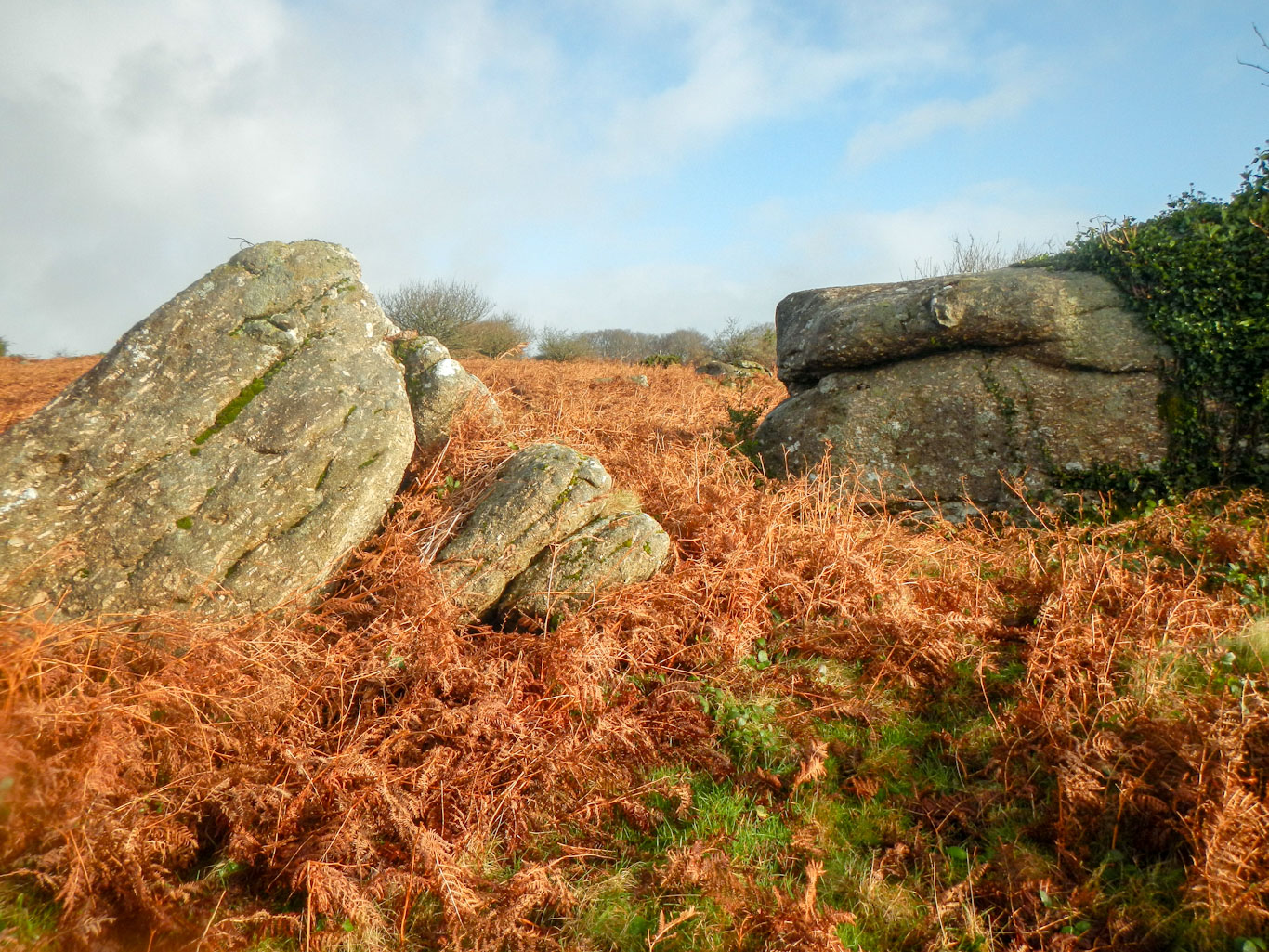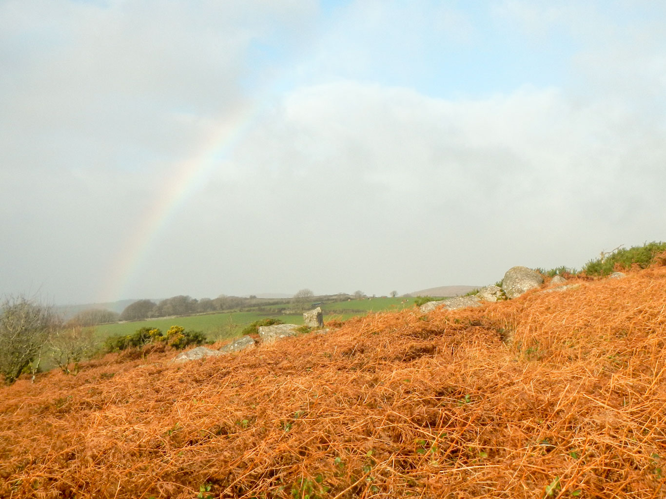 We soon turned off the lane and on to bracken covered Pepperdon Down. There were numerous “paths” through the bracken. My Satmap came into its own as we twisted and turned along the maze of “paths” to arrive at Pepperdon Rocks, an area of granite outcrops more scattered than our previous two tors. We saw a whole rainbow as well as views of Moretonhampstead from a vantage point near the rocks.
