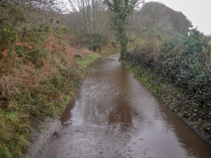 We descended to the road, realising that following a path was easier than taking a shorter route through the bracken. This brought us out on a further narrow track-like lane further south than we needed to be. We headed north up the lane which was flooded. In my gaiters, I was happy to paddle through the flood but my daughter took a drier although more precarious route along the high verge.