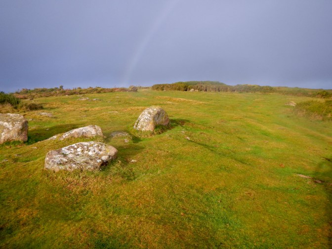 Although this was where we had the heaviest rain shower of the day and we were climbing up hill, the clear track on well drained springy turf was much more to my daughter’s liking and the type of terrain she had hoped for all day. She was wearing a fairly heavy Goretex waterproof jacket which she had kept on all day. I was still only wearing my favourite Rab hoody wind top but rightly decided it would only be a short shower and there was no need to open my rucksack to don my waterproofs. We saw yet another rainbow! We also passed a stone circle before turning north east at the hill summit, crowned by cairns (Giant’s Grave).