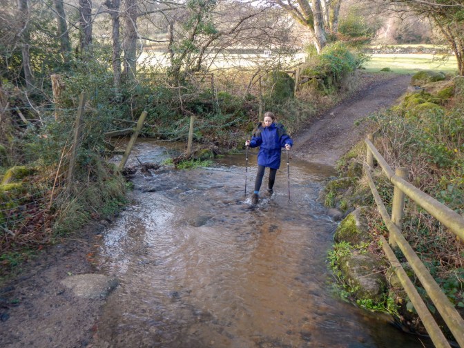 We reached a track and descended through woods, noting an un-named rocky outcrop near the path. The descent continued through fields before we reached a ford (tributary stream to the River Teign). It proved to be a bit deep for my daughter – I should have loaned her a spare pair of gaiters as well as the waterproof jacket. However she managed with only minor water ingress over the top of one boot – and I did pass my walking poles to her to reduce the risk of her falling.