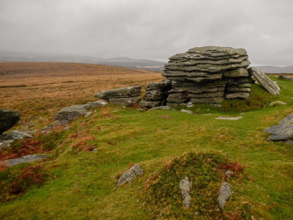 I climbed further and arrived at the large Yar Tor, with excellent views especially over to Corndon Down where I would be going next. Near the summit, I also saw the first of several stone cairns. This one seems to have been rearranged to form a spiral maze.