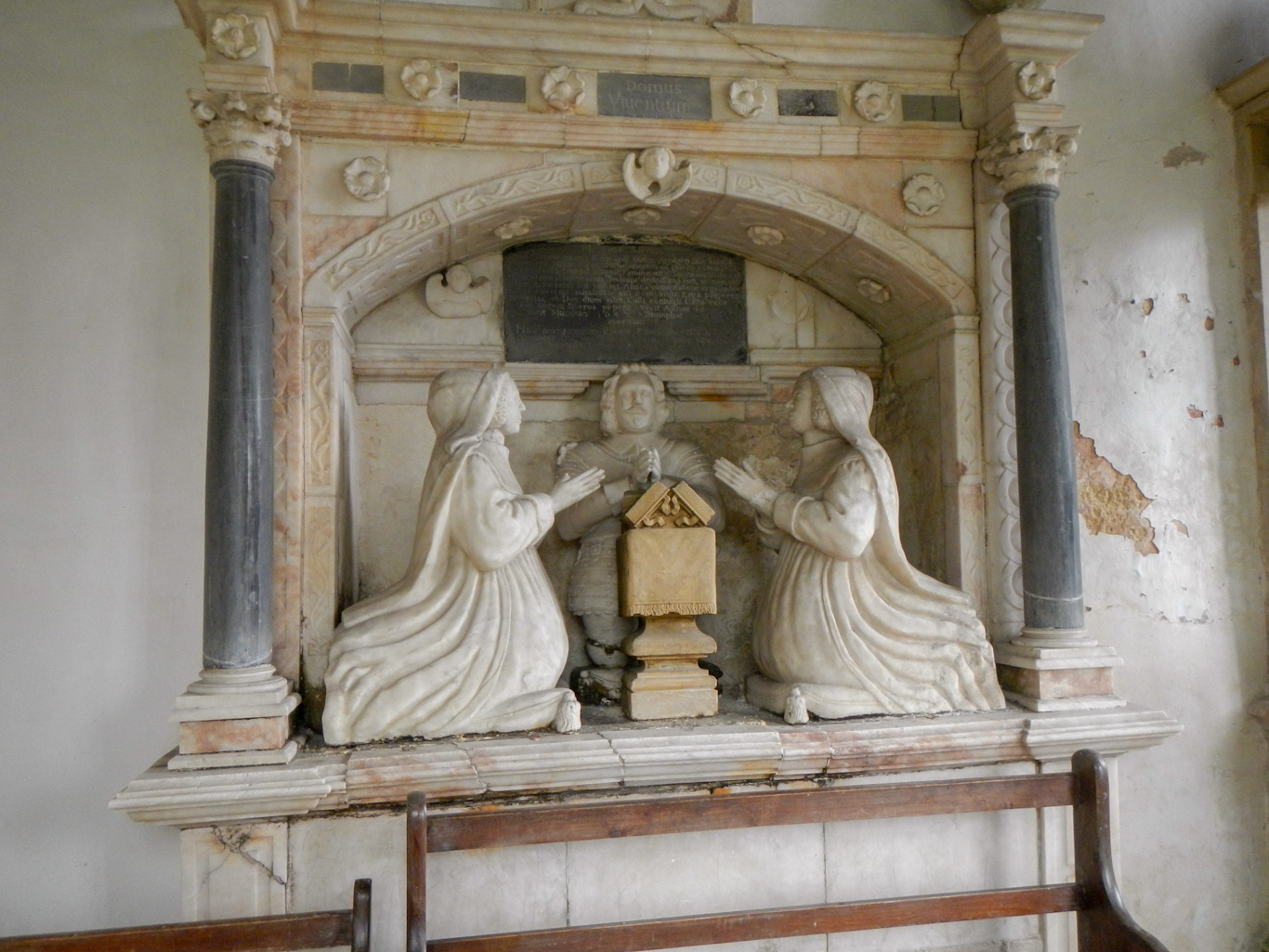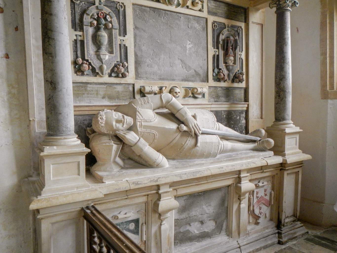 The primary aim for my “adventure” had been to visit the Rollright Stones, steeped as they are in ancient history and embellished with legends. However it turned out that a major highlight was yet to come on my return route to Salford. The village of Little Rollright is almost hidden in the bottom of a small valley and accessed only by a single small lane and a footpath. The small and simple church stands on some slightly higher ground. There are two fascinating and well preserved seventeenth century wall tombs set into the north wall of the chancel. One knight has his helmet as a very hard pillow and the other appears to be flanked by two wives.
