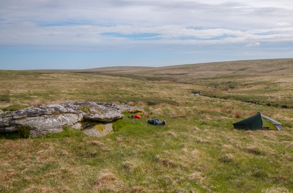I made my way on to higher ground and found a camping spot just south of Evil Combe, overlooking Calveslake Tor across the river. I was able to wring water out of my trousers, socks and walking boots. Despite my sodden state there was nothing for it but to pitch the tent again and set up the stove. I put my trousers on a rock to dry but then realised they’d dry more quickly on me. Thank goodness for modern easy dry fabrics!