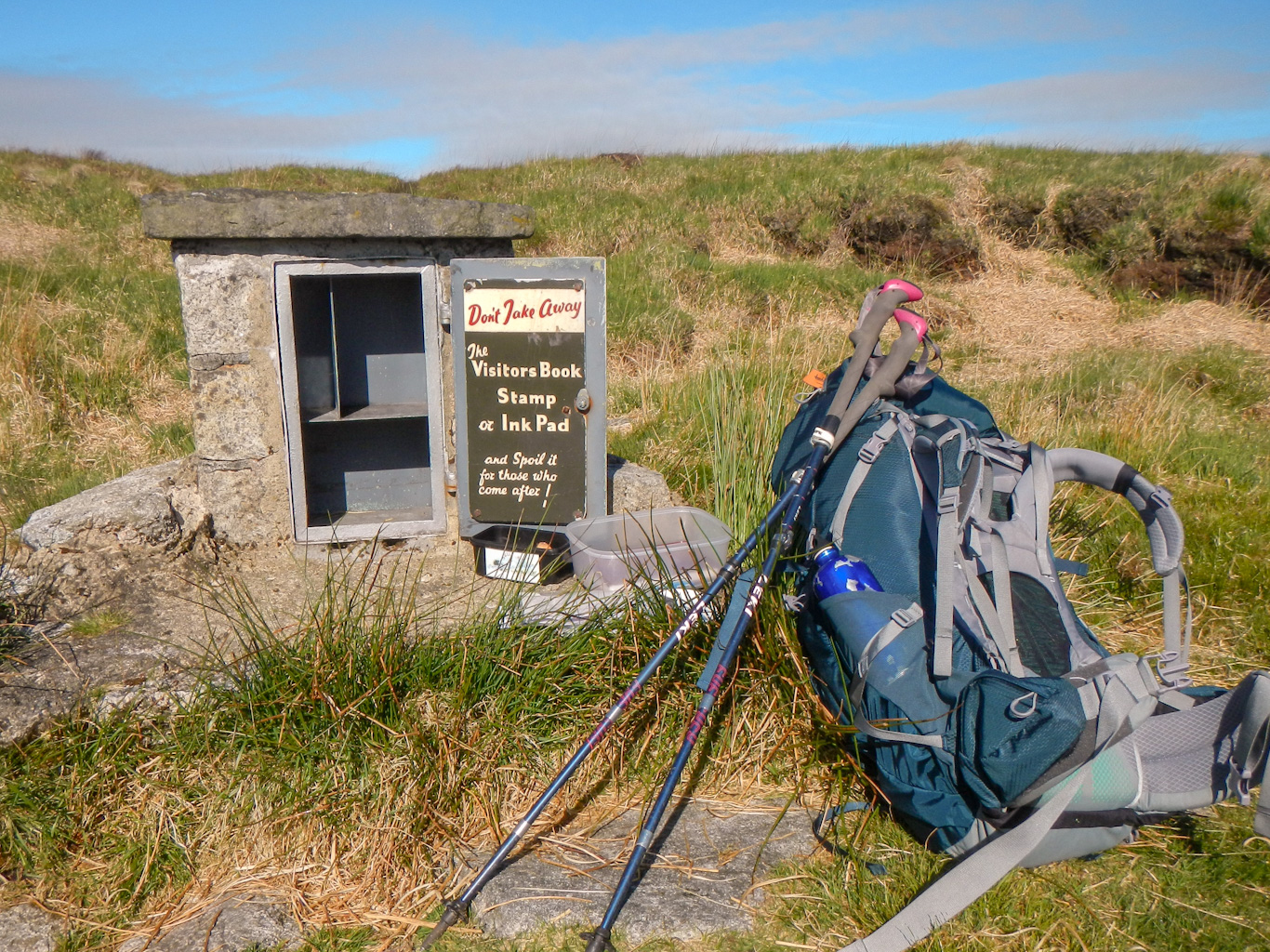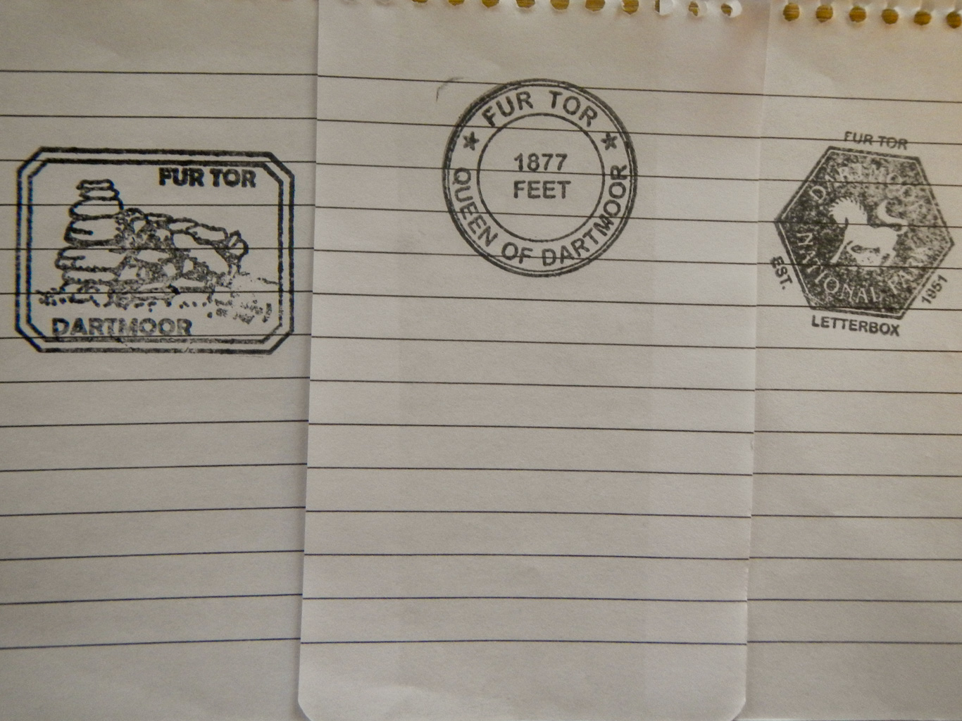 After lunch, I turned towards the main moor. Fur Tor is huge and I could see it on the horizon. Notwithstanding the ease of route finding, it’s a long trek across featureless moor. Two walkers were leaving as I began my push uphill to reach 572m. The views on this clear day were excellent. Luck was on my side and quite by chance I noticed a black box under an overhanging rock. It was an incredibly well kept Dartmoor letterbox complete with three rubber stamps including one proclaiming the tor as the queen of Dartmoor and a very impressive bound visitors’ book. I’ve visited Fur Tor and bagged it previously but didn’t find the letterbox that day.
