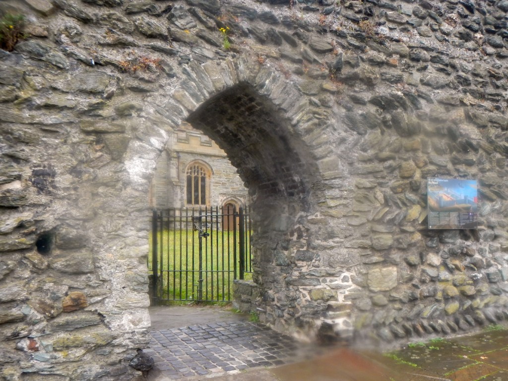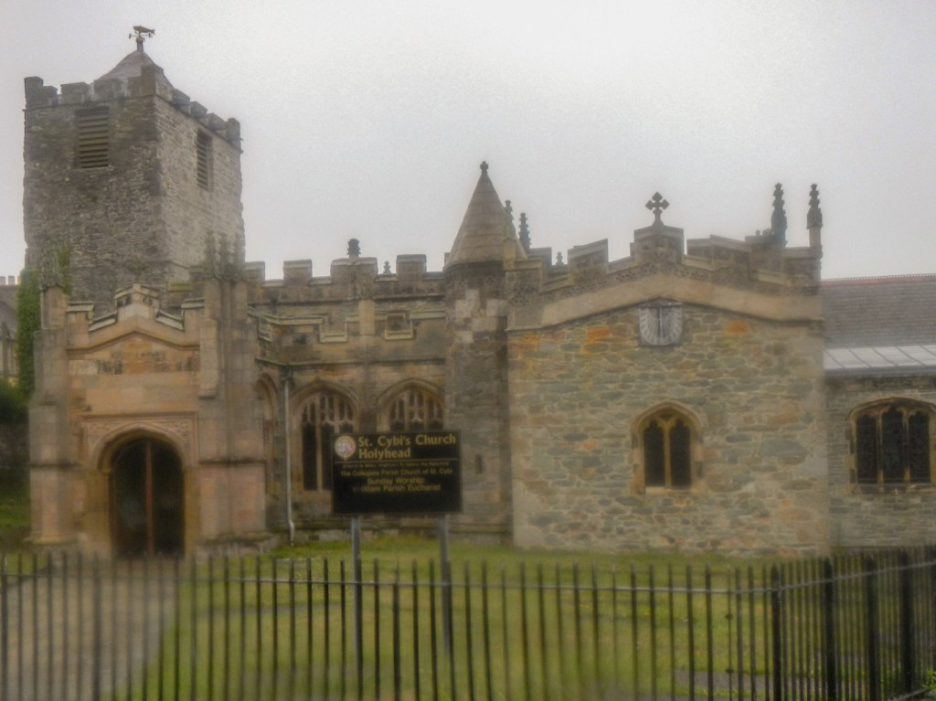 The walk began by passing a pleasant beach before some pavement walking prior to reaching the dock area in Holyhead. There was an interesting modern walkway bridging part of the old inner harbour and almost passing through the railway station. I emerged on a main shopping street and turned towards St Cybi’s Church which was built within the walls of a fort of the late Roman period.