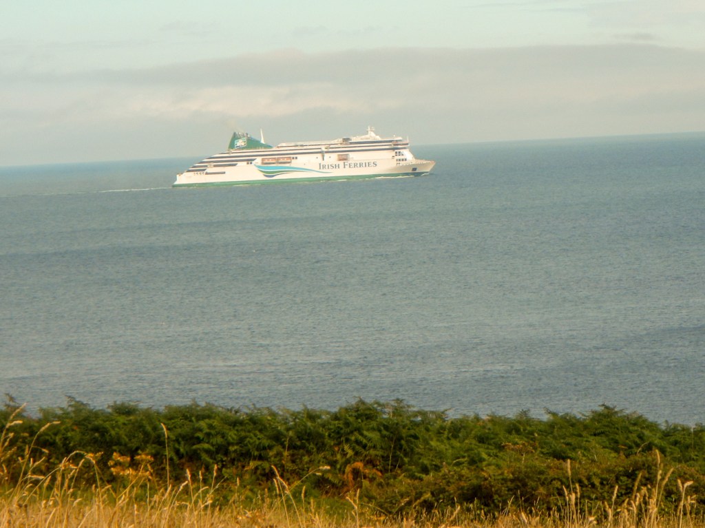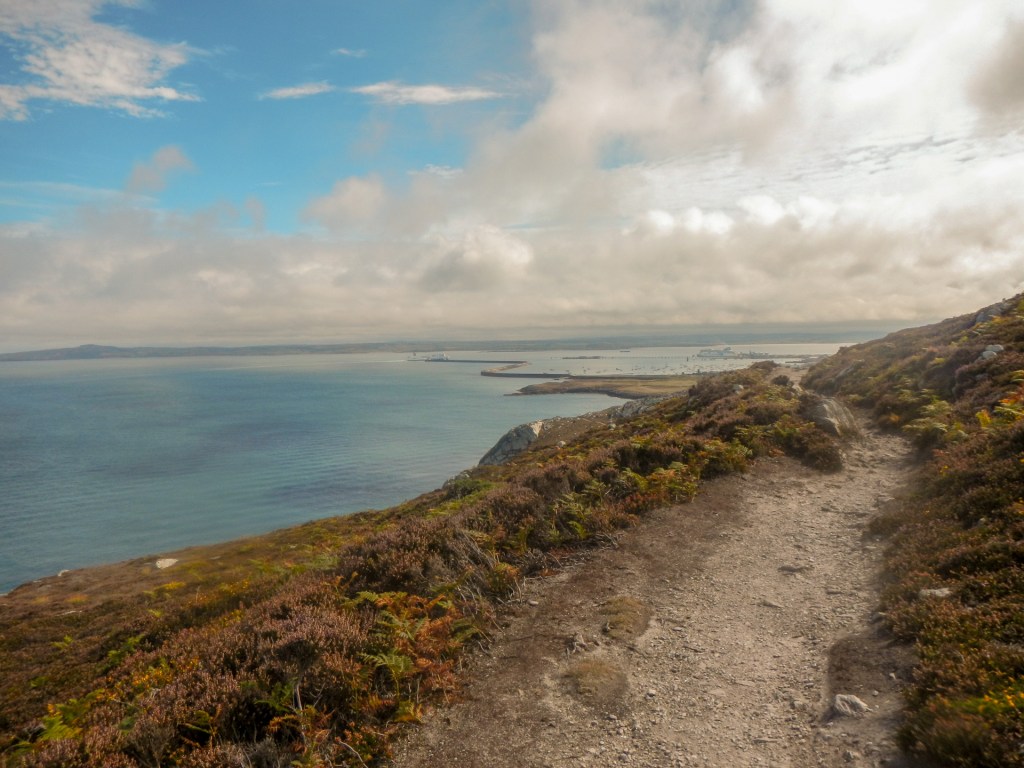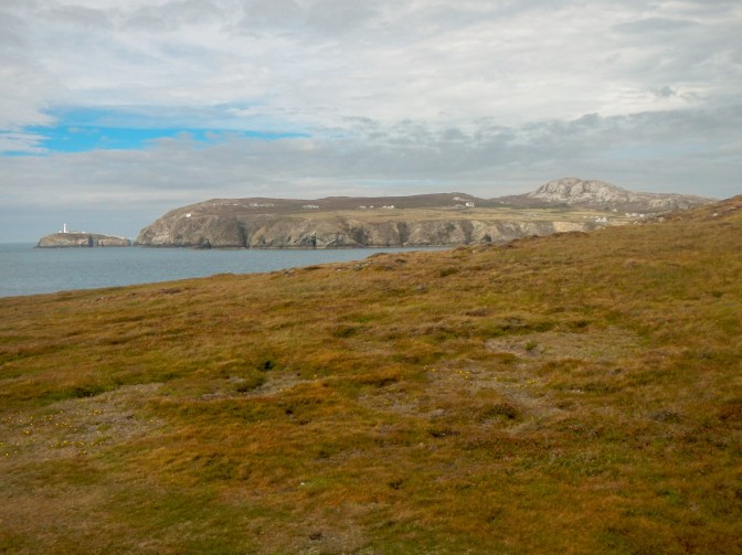 I entered the Breakwater Country Park. The path was rocky in places. I enjoyed excellent views of the 2.39km long breakwater, which was built between 1846 and 1873 using rock quarried from rocks near where I was walking. It’s the longest breakwater in Europe. I saw a couple of the large ferries from Ireland approaching Holyhead. The path continued to be rocky as I approached North Stack, before turning south. Unfortunately, after taking a further rest, I left my camera on the ground. Fortuitously I realised after ten minutes walking when I saw a view of South Stack lighthouse in a gap between two hills and stopped to take a photograph. Reluctantly I turned back and fortunately found my camera lying where I had left it.