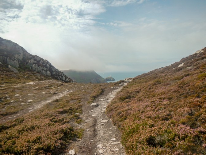 I have to be honest and say that by the time I was walking along the promenade on the north side of Holyhead, my pace was already decreasing and my right ankle painful. The weather was still murky and damp, so the Jehovah’s Witnesses sheltering with their pamphlets on a covered seating area at the beginning of the promenade called after me to say they hoped the weather improved. After having a rest on a similar covered seat at the opposite end of the promenade, I proceeded up a narrow lane and turned on to a path towards a small bay. A group of kayakers was getting ready to launch – from the conversation I overheard they appeared to be on a paramedic course, so I made sure I wasn’t limping too much!
