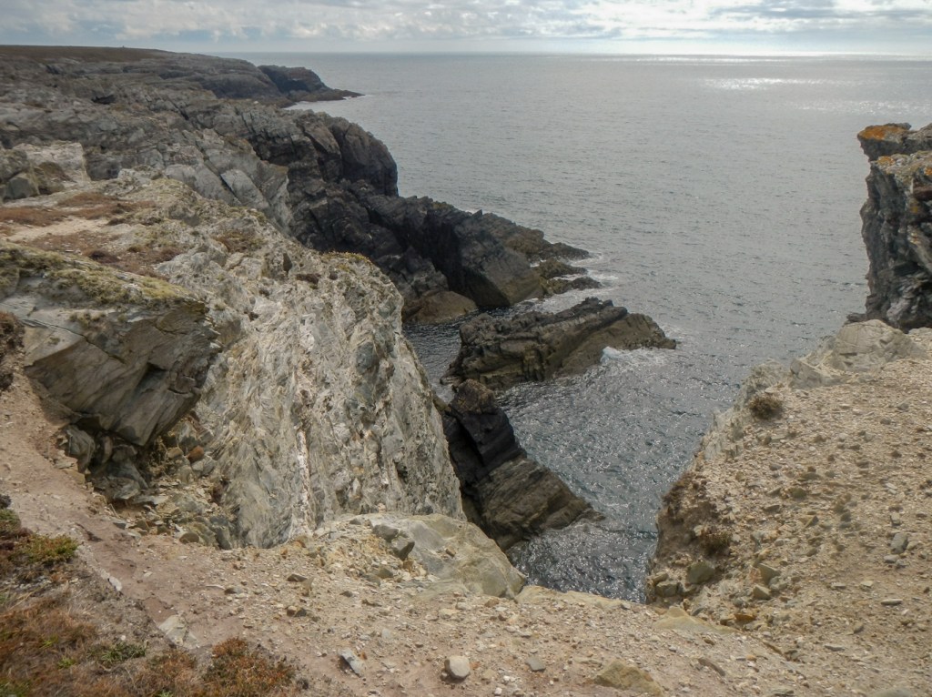 The path became more rocky and it was difficult to pick the easiest route as there were alternative lines that had become eroded. I struggled with a particularly steep piece of path that I’m sure would have been avoidable by taking a different line. I saw someone ahead sitting on a rock. It was my husband at the lower end of the diversion to reach the summit of Holyhead Mountain. He had been up already, having driven to the RSPB South Stack Visitor Centre. Apparently at 10am when he arrived at the centre, the visibility had been negligible but now the weather had improved and visibility excellent. He dissuaded me from trying to climb to the summit however as he said that the path was steep and rocky with loose stones.
