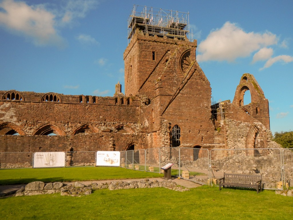 We parked in the large car park adjacent to Sweetheart Abbey. The Abbey is closed to visitors at present due to some building safety issues. However this meant that Historic Scotland had decided to allow free access to the outside cloister area along with information boards. The Abbey was founded by Lady Dervorgilla of Galloway in the thirteenth century as a Cistercian Foundation. Her husband and sweetheart, John Balliol, agreed to provide funds for scholars studying at Oxford following an argument with the Bishop of Durham. After his death, further endowments by Dervorgilla led to the foundation of Balliol College. Lady Dervorgilla carried her late husband’s embalmed heart in an ivory casket from his death in 1268 until she died in 1289. She was interred along with her late husband’s heart, in a site in front of the great altar of the abbey she had founded, hence the name “Sweetheart Abbey”.