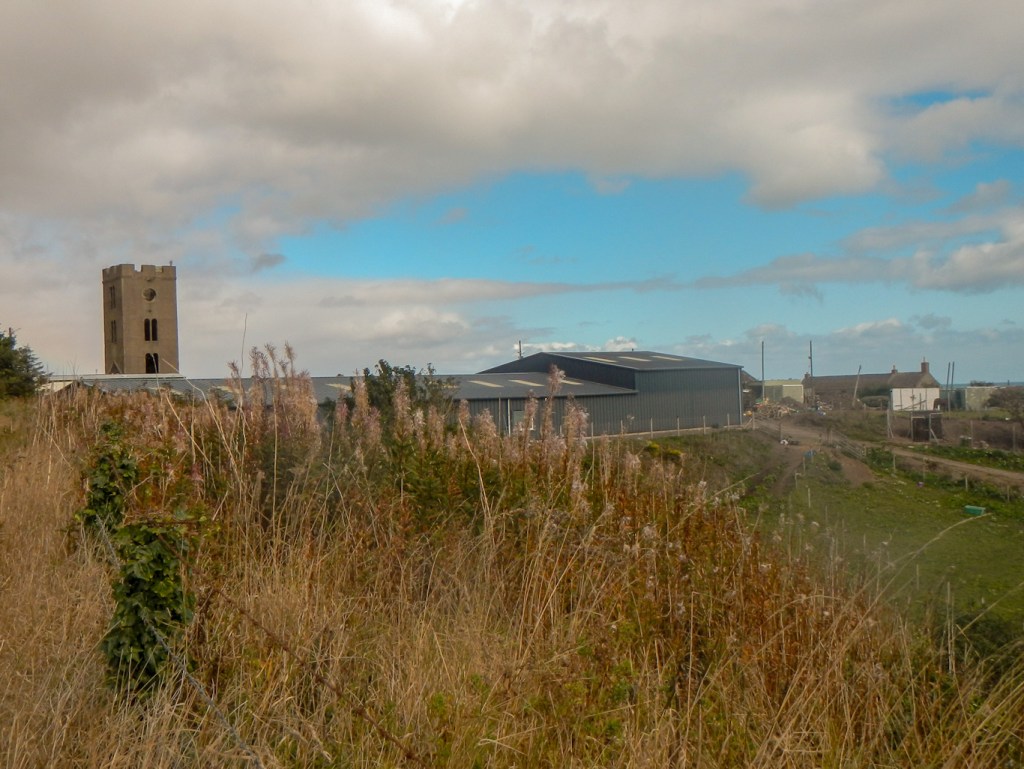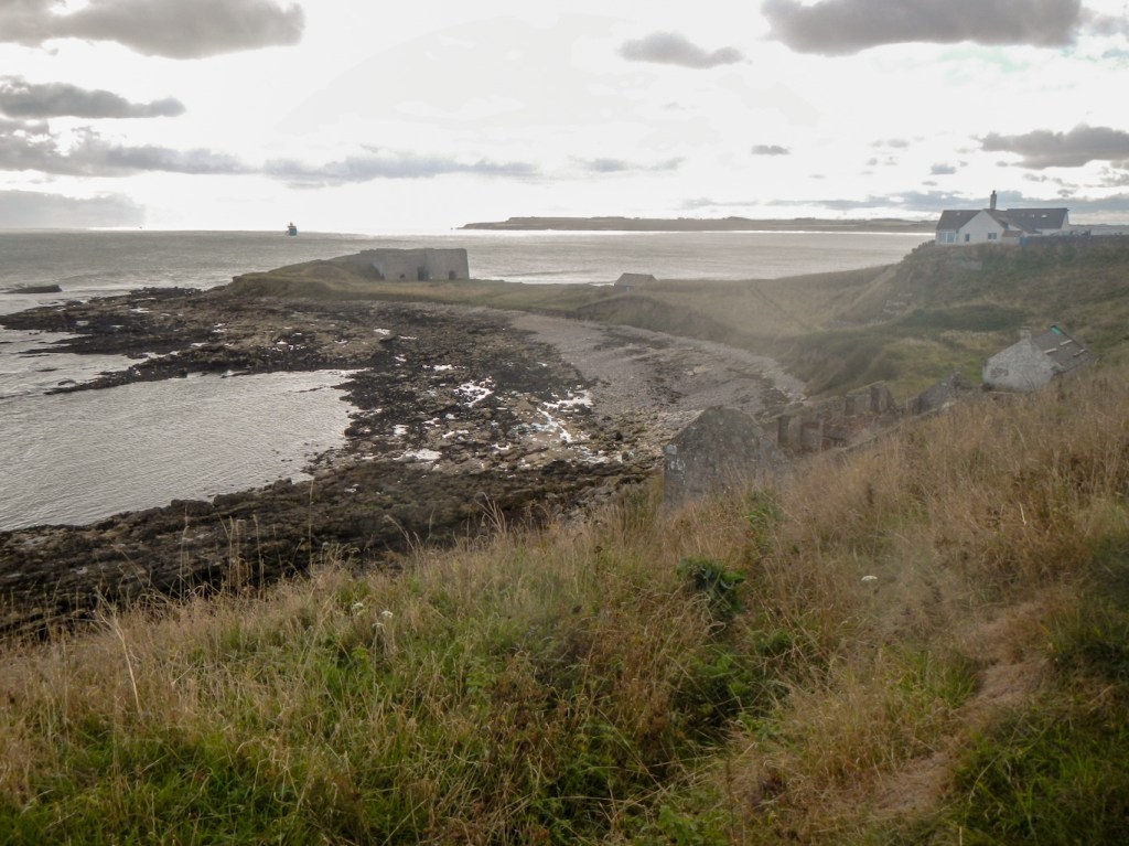 We got ourselves back on to the coast path at Usan where we saw ruins of cottages and a prominent tower; presumably this was an abandoned fishing village and in fact the sign on the gate indicated that the area is used nowadays for processing wild salmon.