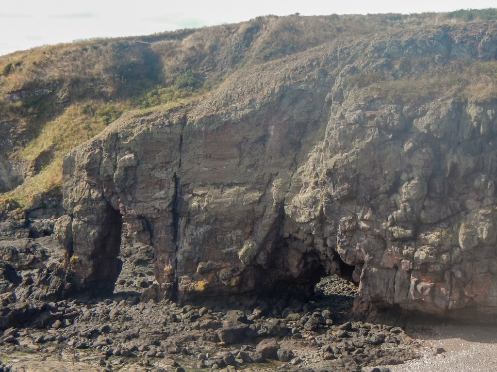 The route continued above ruined salmon bothies of a salmon fishing station on Boddin Head. There were views to a lime kiln on the point itself and views onward towards Lunan Bay. Unfortunately it started to rain, so we donned waterproofs quickly, remembering the speed of onset of the heavy rain shower the previous day.