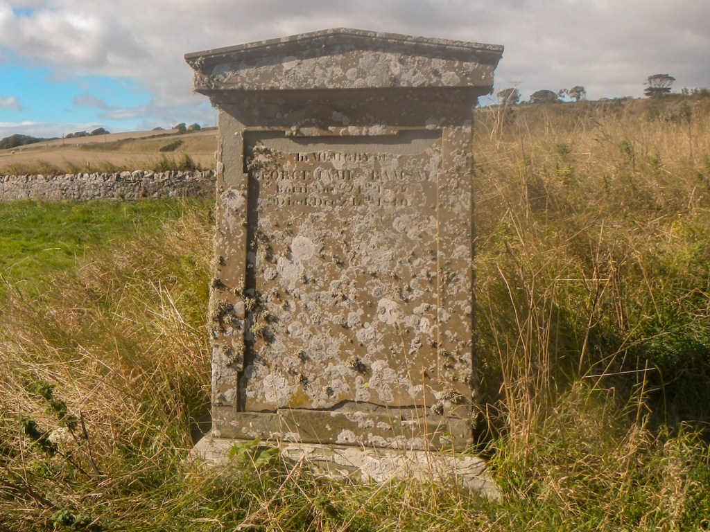 Having followed the cliff path as it turned towards land, we discovered the chapel of St Skae dating back to the twelfth century with adjacent cemetery. We were intrigued to notice a gravestone inscribed “In memory of George James Ramsey Born November 24, 1859 Died December 17, 1840”. It’s a large stone and I guessed was the grave of an adult – maybe it was meant to be 1759-1840. However on searching the internet George James Ramsay was born at Craig, Angus, on the 24th Nov 1839 and died just over a year later on December 17 1840. I wonder why the parents accepted this error on their son’s gravestone – maybe they were unable to read. Anyway it’s a huge stone for such a young child.