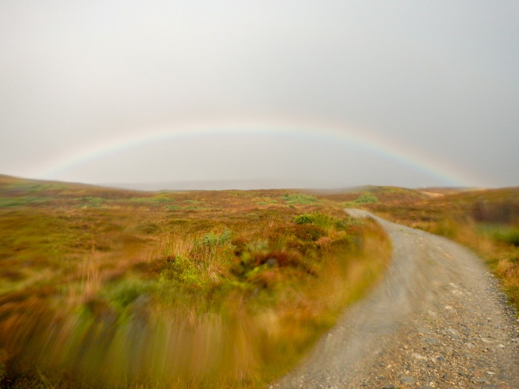 Eventually we left the tarmac and walked through a wood, continuing to gain height. We emerged on to the moor, ascending all the time. The weather forecast had promised better things. Unfortunately, however, the weather was worsening. The area is said to abound with mountain hares but they must have decided to stay underground out of the wind and rain! We passed a bothy – sadly locked and clearly for grouse shooters rather than for walkers. We saw a rainbow so there must have been some sunshine around but this definitely seemed to be more than a short shower.
