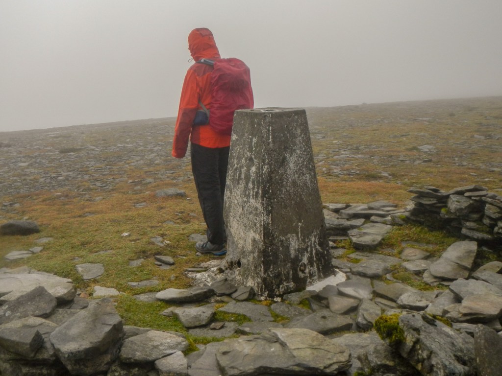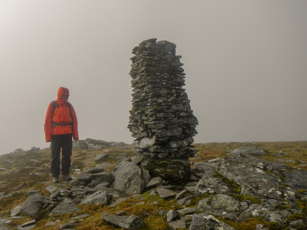 It was a very brief lunch stop and the weather was no better by the time we walked further along the ridge to the highpoint (878m) at the Carn an Fhreiceadain trig point. The next point of interest was a tall cairn which was meant to be a point with good views.