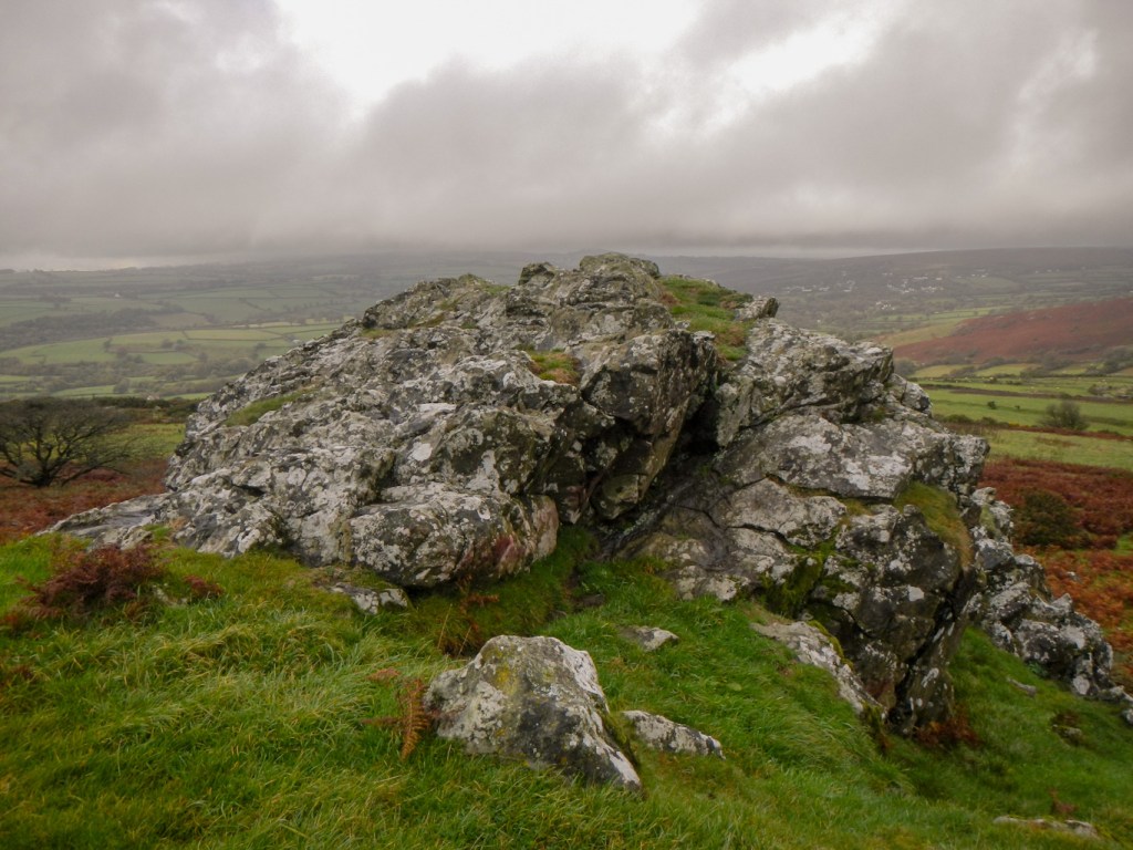 I parked in the big car park on the left side of the road about a mile after passing through Merrivale. This seemed much easier than trying to navigate the narrow lanes around Peter Tavy in my car. A track opposite the car park skirts Cox Tor, which wasn’t on my list today. After this it was a short walk up a narrow lane to take a left turn on to a bridleway and reach Sharp Tor (Peter Tavy).