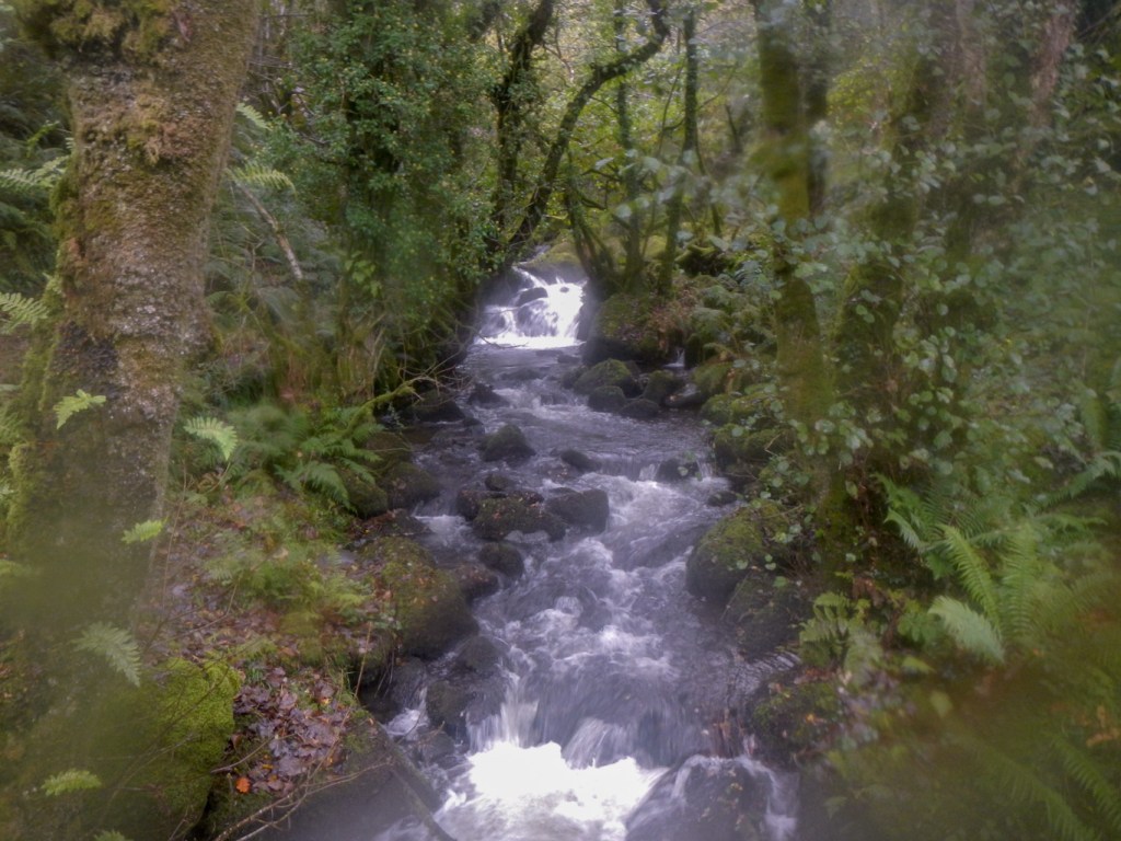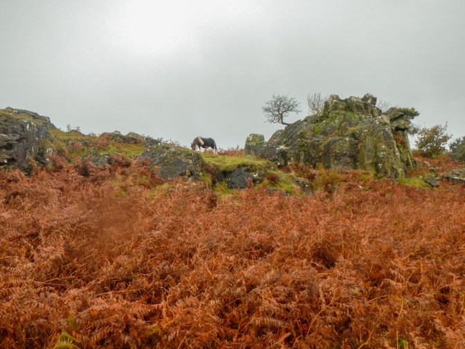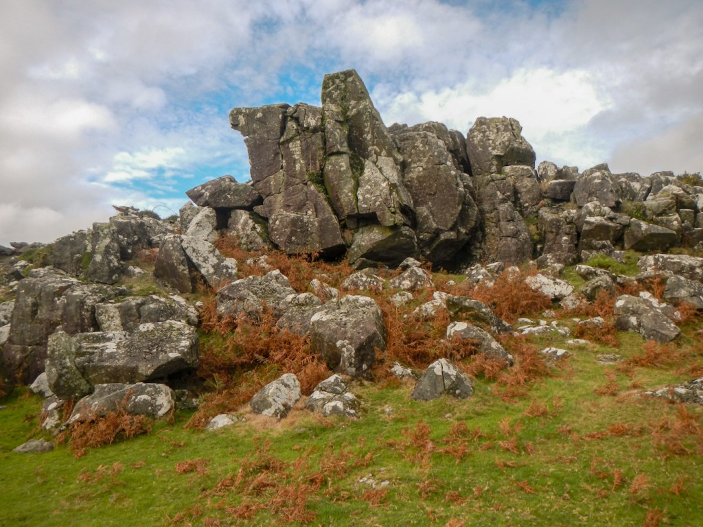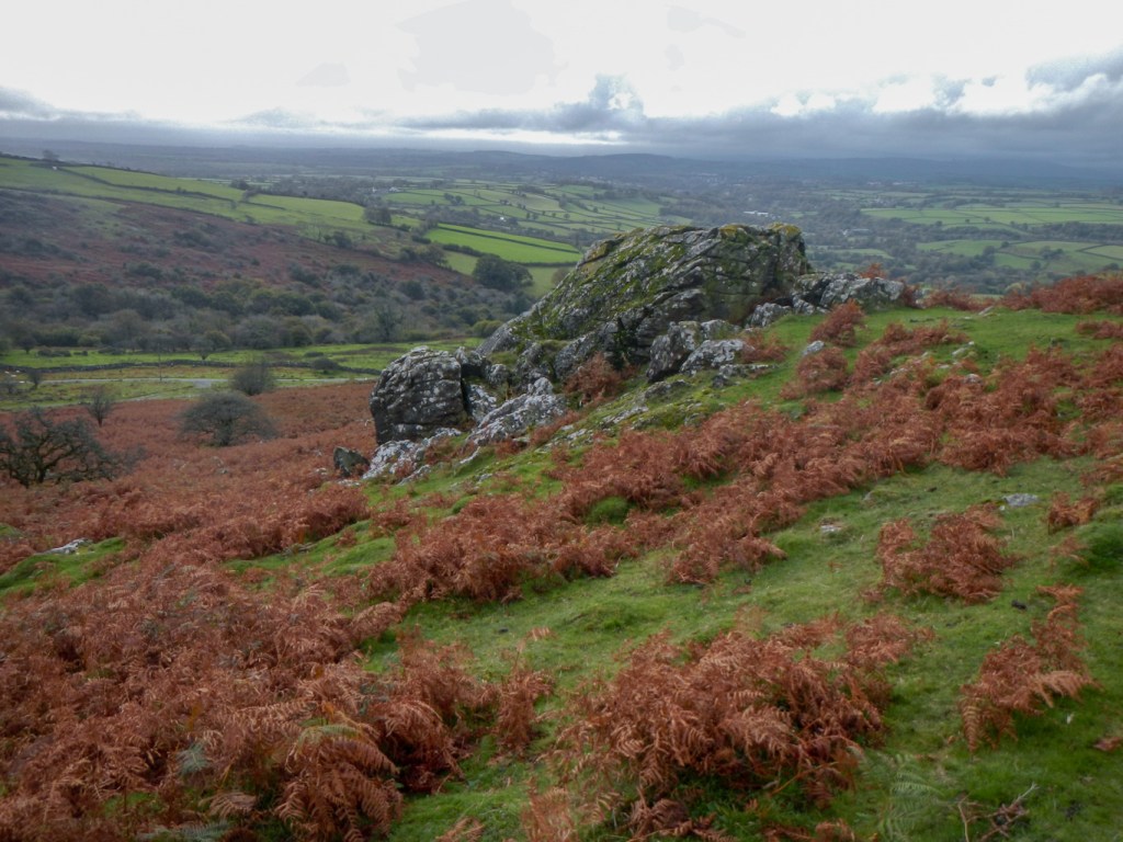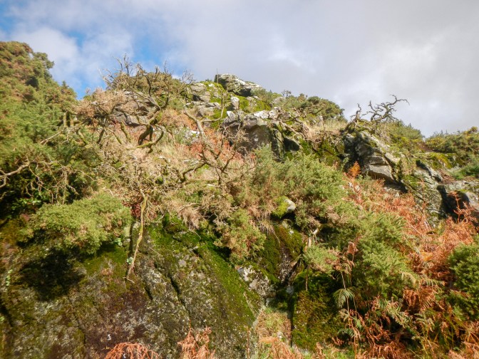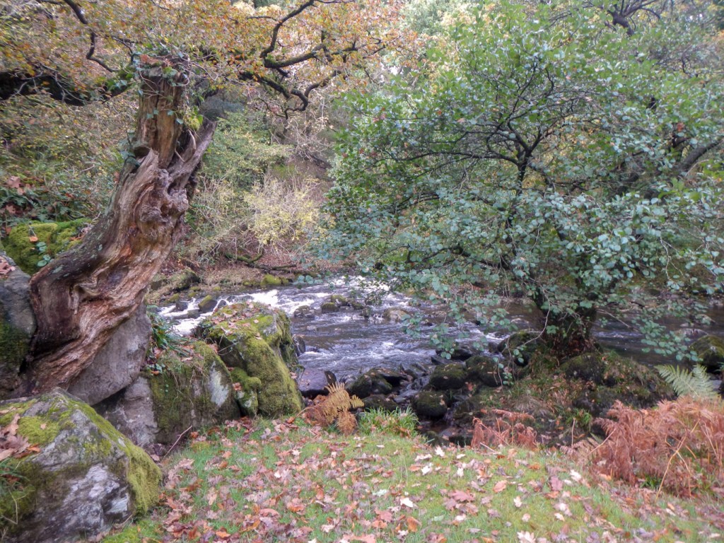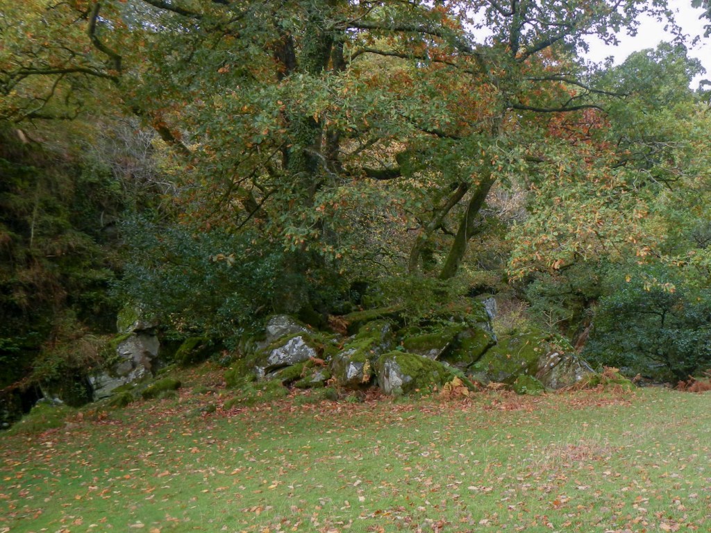 I turned back and followed Colly Brook downstream to Peter Tavy. I noticed that the Pit Stop was open at the Community Hall and would have stopped for some refreshment, but it seemed too early in the day. I’d never been to Peter Tavy previously. The church has a really tall tower dominating the village. However I was keen to press on along the Dartmoor Way, to reach Longtimber Tor just off the path on the banks of the River Tavy. This was a lovely spot with many mature oak trees; acorns and leaves carpeting the ground. I had already bagged four tors and it wasn’t even lunchtime!