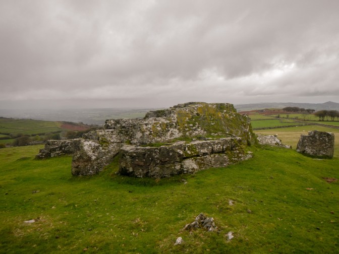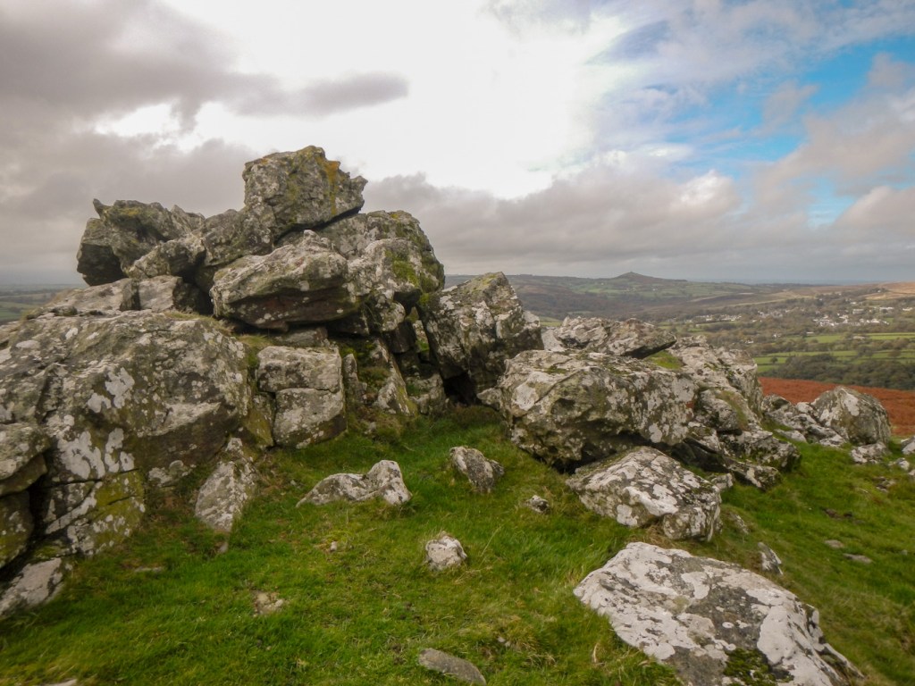 There wasn’t much ascent to climb up to Boulters Tor which consists of two outcrops with a wall built over them. This is on the LDWA list. I also bagged two more tors in quick succession but not on the LDWA list – Little Boulters Tor just down from the hill summit and the scattered array of Smeardon Down Tors. At Smeardon Down Tors, I could see a distinct conical hill in the distance with what appeared to be a building on the summit. This turns out to be Brent Tor topped by a church. It looks impressive and I’ll certainly try to go there sometime even though it’s a long way from Exeter.