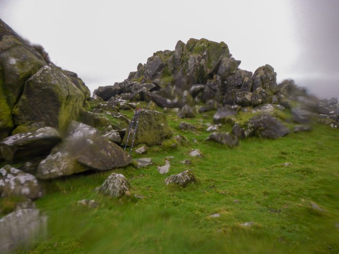 Somehow I “lost” the path while I was exploring Great Combe Tor. Eventually I found it again. Almost immediately it started raining once more. This time the sky looked dark and cloudy everywhere so I succumbed to pulling on my waterproofs. I crossed a very turbulent Colly Brook on a footbridge and deviated upstream to Little Combe Tor.