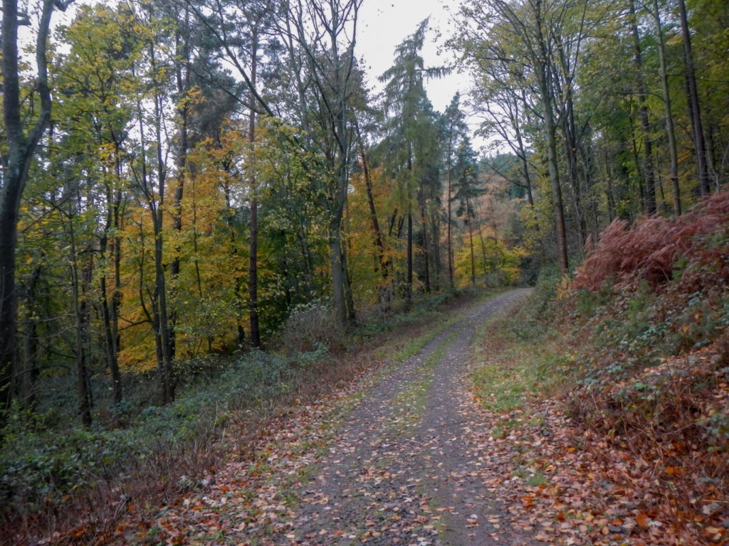 Within a few yards I was off the road and climbing on a stony footpath through mixed woodland. I saw several birds and thought I heard the screech of a jay. Squirrels scampered across the path ahead of me to jump on to tree trunks and perform aerial acrobatics from branch to branch. The path was covered with wet leaves. To my left there were breaks between the trees and there were cows grazing in the fields. I passed a few other walkers and a mountain biker who had stopped for a rest.