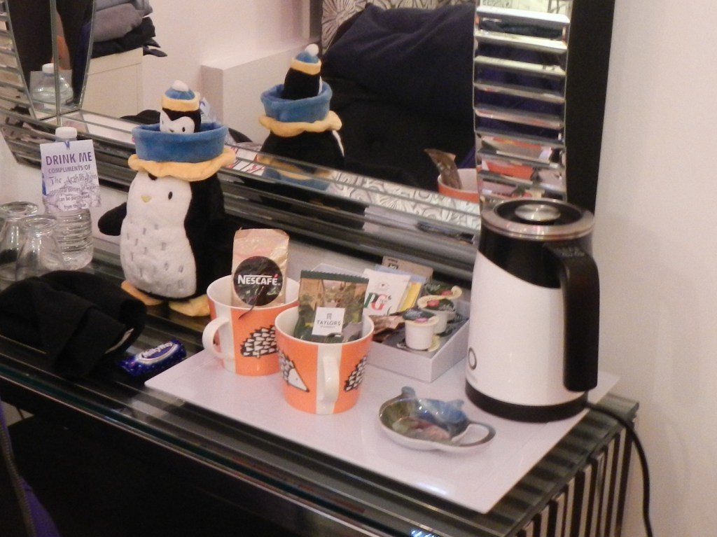 We were shown our room. This was amazing – full of quirky ornaments including a penguin that sang “Winter Wonderland” as well as an electronic kettle where the desired temperature could be set. There was also a stick of Blackpool Rock and a pack of gingerbread men biscuits. I could have spent all evening looking at the room but my husband managed to drag me away reminding me that I would be disappointed if I missed my “adventure”.