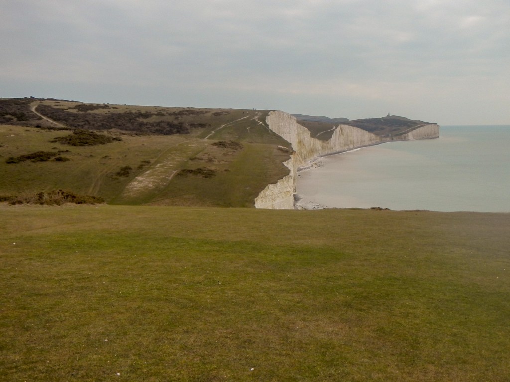 The path returns to the valley before rising again almost immediately over Haven Brow. It is a superb surface to walk on – springy grassed chalkland and I was walking at a cracking pace overtaking all and sundry. The walk continued to be airy with superb panoramic views behind, ahead and inland to my left. It is an undulating route over the spectacular “sisters” interspersed with dry valley bottoms. The “sisters” arrived in rapid succession and I lost count of the numbers – Haven Brow and then Short Brow, Rough Brow, Flagstaff Brow, Flat Hill, Baily’s Hill and the final “sister” who appears to be unnamed but is graced with an obelisk recording the dedication of land to the National Trust in memory of two brothers killed in the First World War.