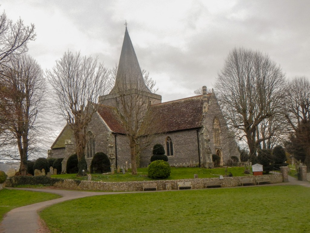The route descends to Jevington where a blue plaque commemorates the birthplace of banoffi pie at The Hungry Monk (now a cottage as the restaurant closed). The church has a fine Saxon tower.