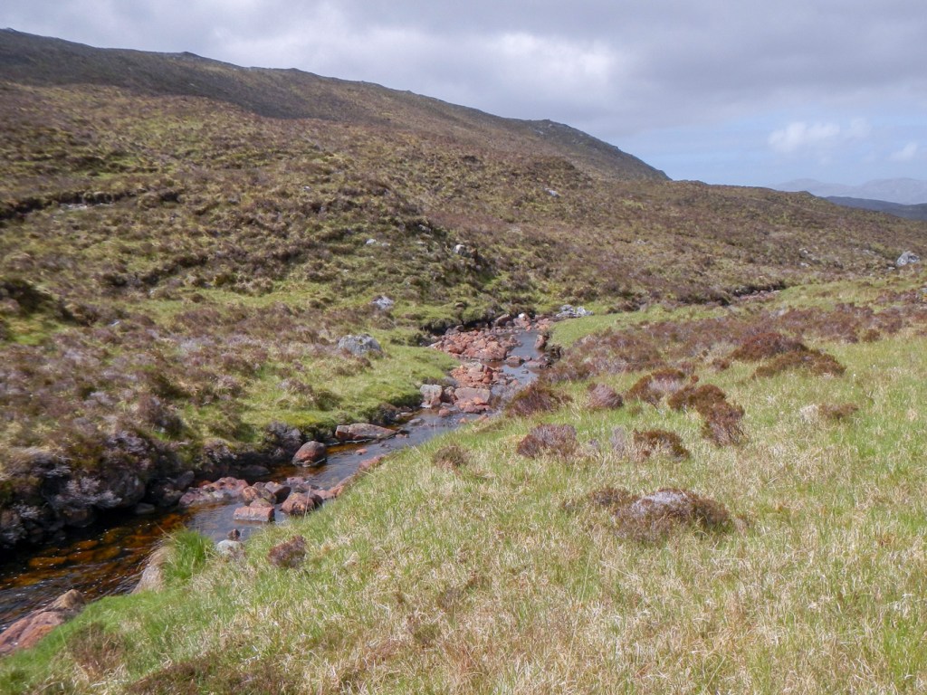 I left the path just before I reached the loch, heading across pathless rough and boggy ground in a generally northerly direction to reach the stream Abhainn a Chlair Bhig, which I would follow down to Ceann Loch Reasort. There is no defined path, although there are animal tracks which can be followed at times. I followed the east bank of the stream, just in case it became un-crossable nearer to Loch Reasort.
