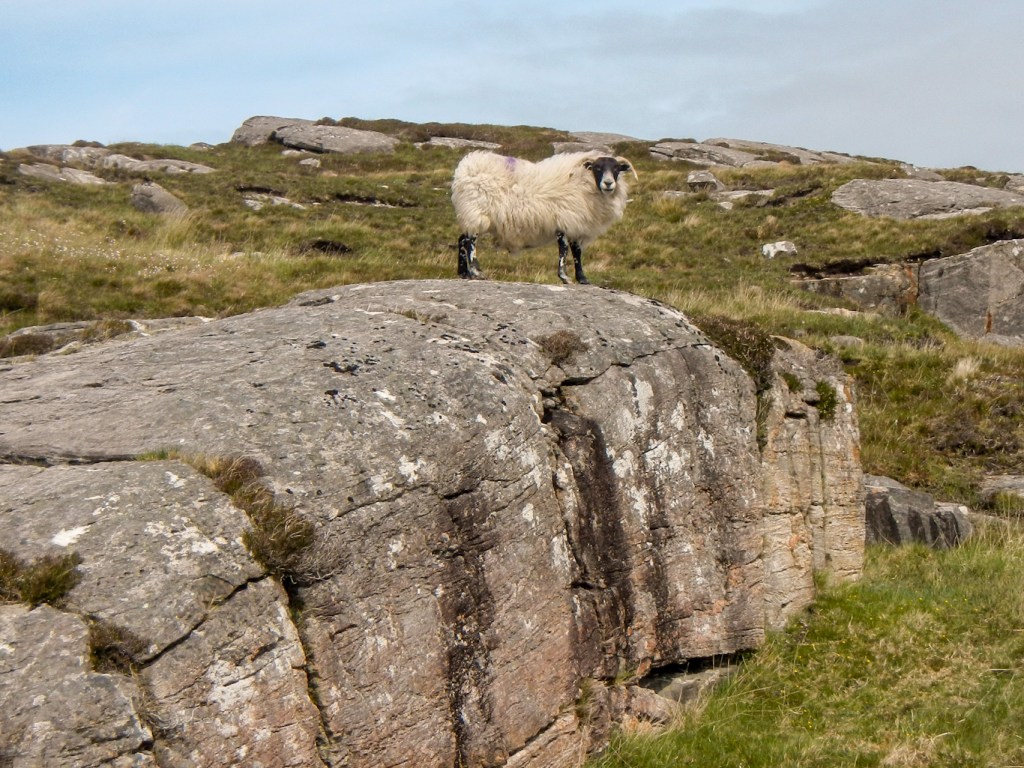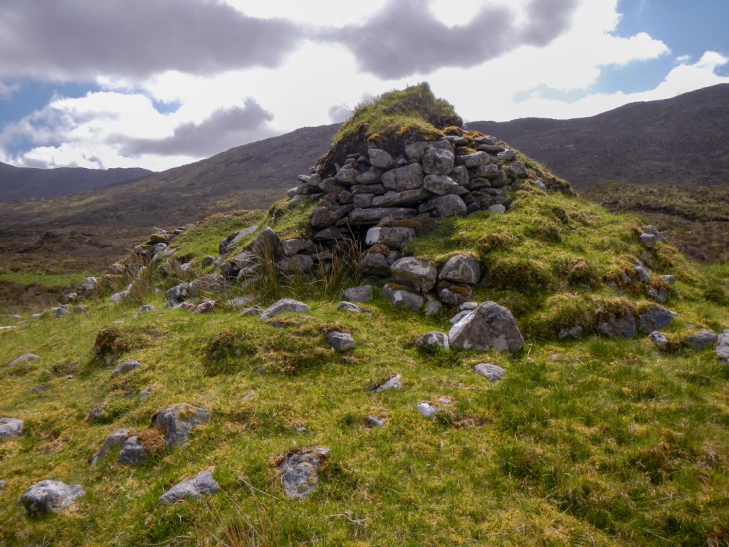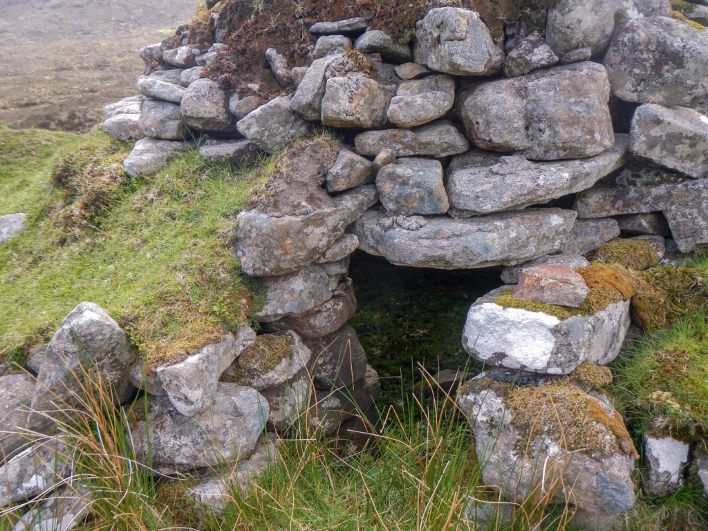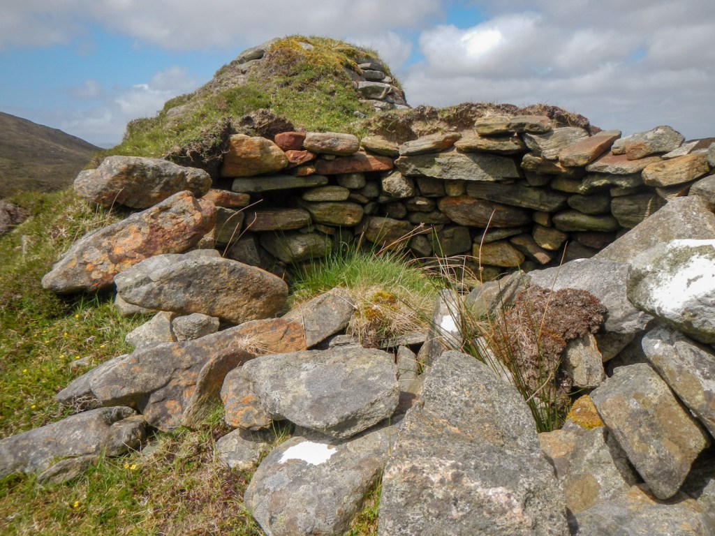 It was of course slow going, carrying a backpack with camping equipment and there being no defined path. Eventually I reached the beehive huts and old shielings marked on the 1:25,000 map. The beehive huts are thought to have been constructed in medieval times. The lower layers of stone were laid horizontally while the upper courses were overlapped in decreasing concentric circles and finally capped with a copestone to give the beehive shape. Once covered in turf, they made an excellent wind and waterproof shelter.
