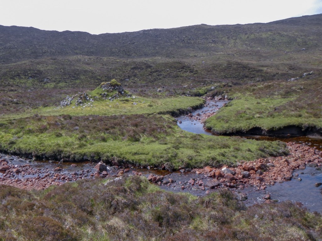 I left the huts, recrossing the stream, and continued to make slow going over rough ground before crossing a tributary stream to reach the head of Loch Reasort.