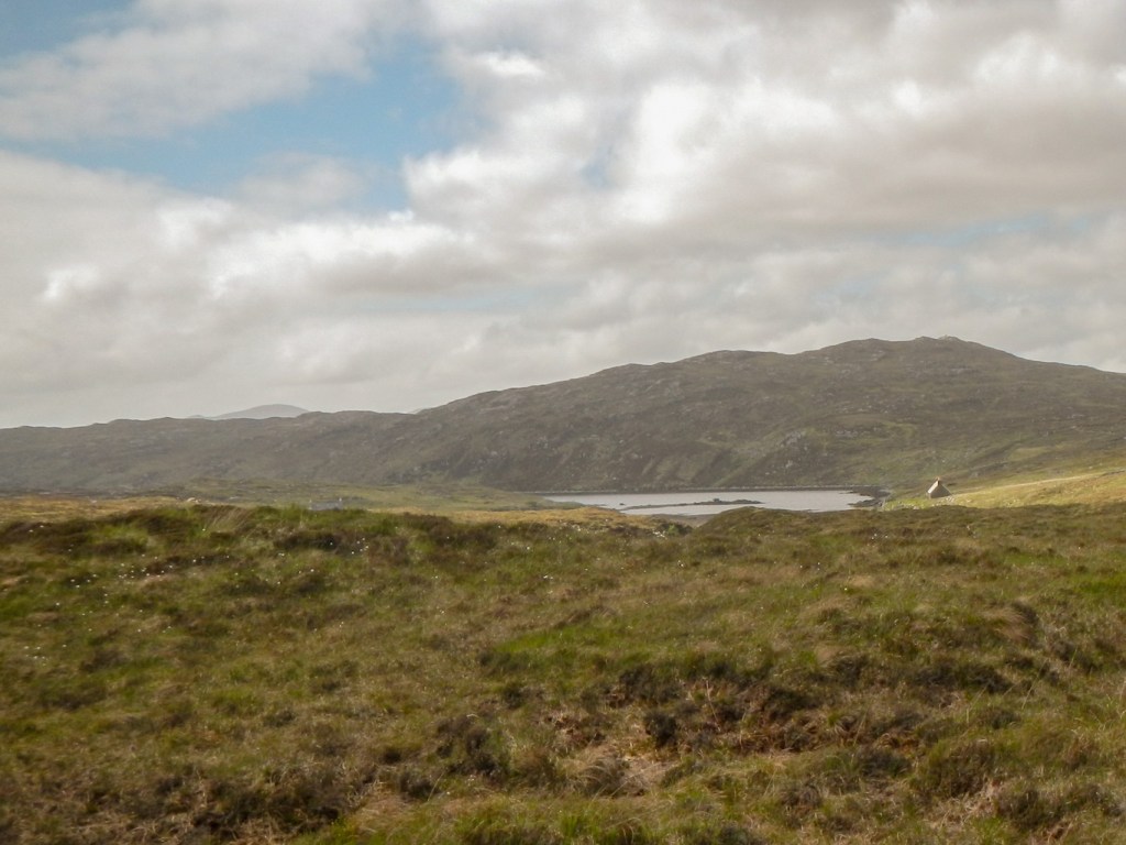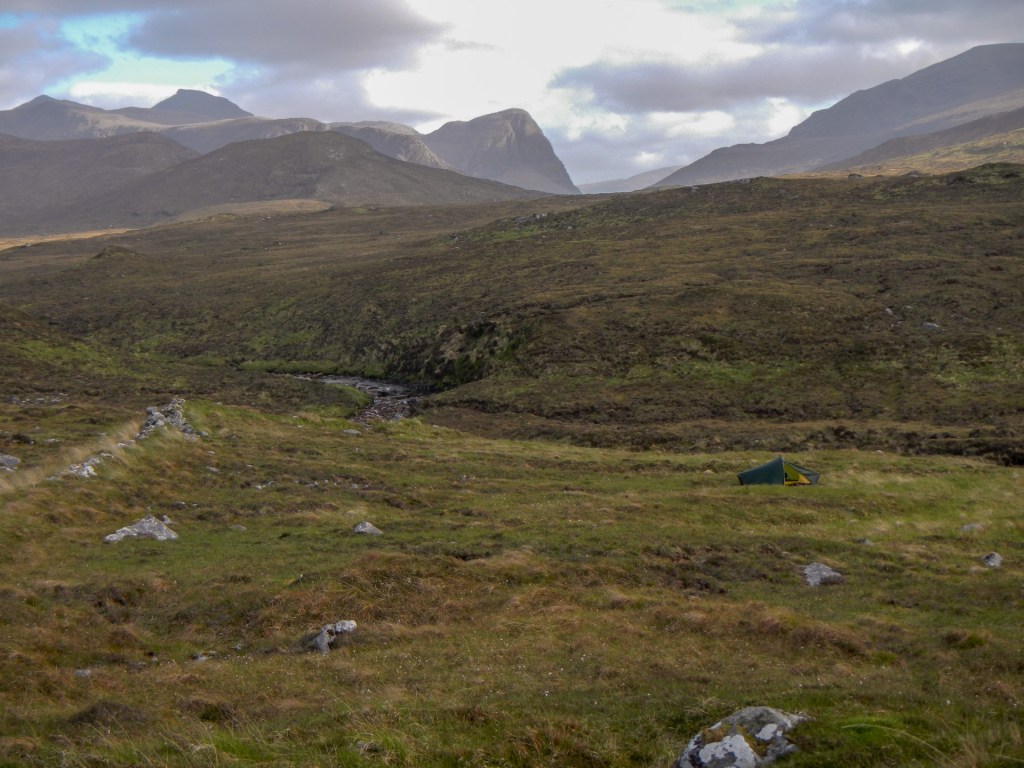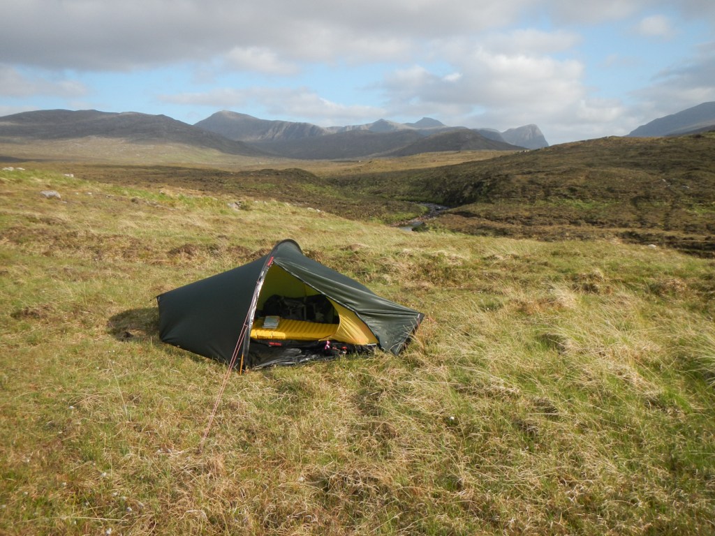 I wasn’t keen to camp in front of the building with the broken door and so I found a flat dry area behind the building to pitch my tent. it was sunny but windy so I was fortunate that the midges stayed away. I enjoyed superb views over the Loch and up to the obvious trig point on Beinisbhal, just to the west of north.