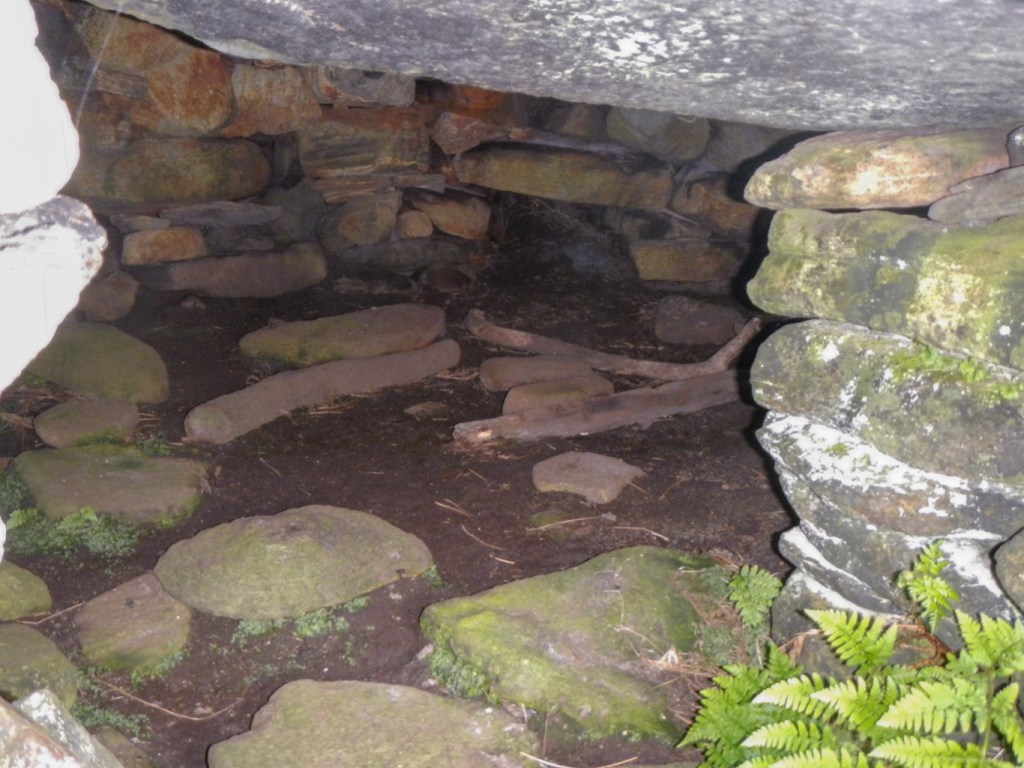 I was able to cross the stream to explore them more fully. I could make out a doorway. There appeared to be a single building which was reduced to a circle of stones and a double beehive which was better preserved.